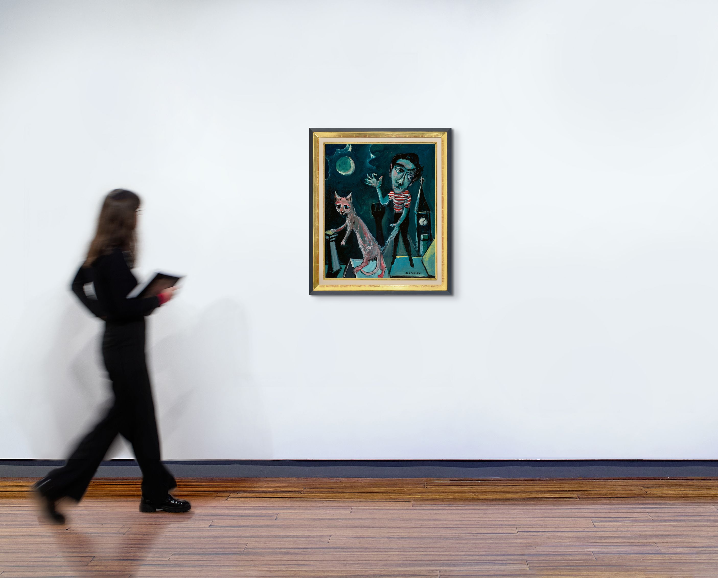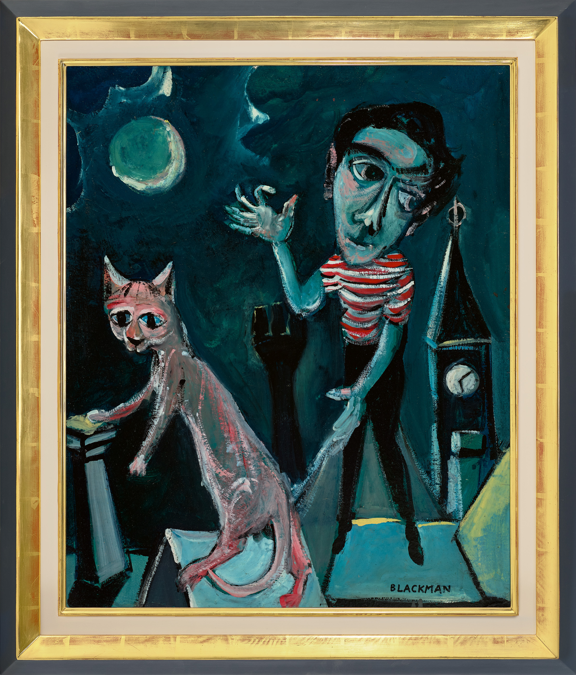 Through the Reeds, Blackman encountered Nolan’s ‘Kelly’, ‘Wimmera’ and ‘St Kilda’ series which both inspired and challenged him, and he would also soon be taken under the wing of the flamboyant Danila Vassilieff. All of these stimuli can be detected in Self Portrait with Cat on Rooftops, where the artist and his feline doppelgänger dance upon the buildings under the gaze of the moon and the clocktower of nearby Hawthorn Town Hall. The image is immediate and whimsical, but also displays the artist’s nascent talent, particularly with the confidence of the brush work and in small accents such as the blaze of yellow contrasting the blue at bottom right. Whilst the cat casts an inquisitive glance at the viewer, Blackman averts his own eyes, hinting at a restless inner world.