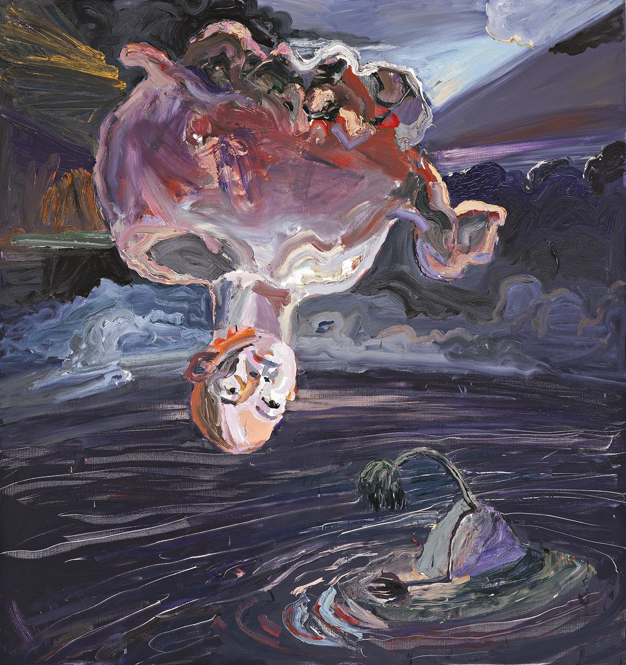 Amid the artifice and debauchery of Australians on tour, Quilty’s inquisitive figure is unsettled. One of only three portraits of Myuran painted by the artist, this figure is suspended from the sky, hovering upside down from a sanguine cloud, removed and observing the rippling black tides of contemporary history.4 With a restricted chromatic palette, Seroquel conveys the uncertainty of our times. The island crowned by a single drooping palm tree recurs in several paintings of 2013, including Survivor, Myuran and culminating in an expansive Rorschach painting The Island, exhibited in the 2014 Adelaide Biennial. Using this motif as a condensed metaphor for the trauma and displacement inherent in our island nation, Quilty presents Seroquel as a meditation on responsibility. The floating figure, caught in its thoughts, is however, unaware of the dawning patch of blue sky in the upper right. Quilty, after all, remains an optimist in the face of adversity.