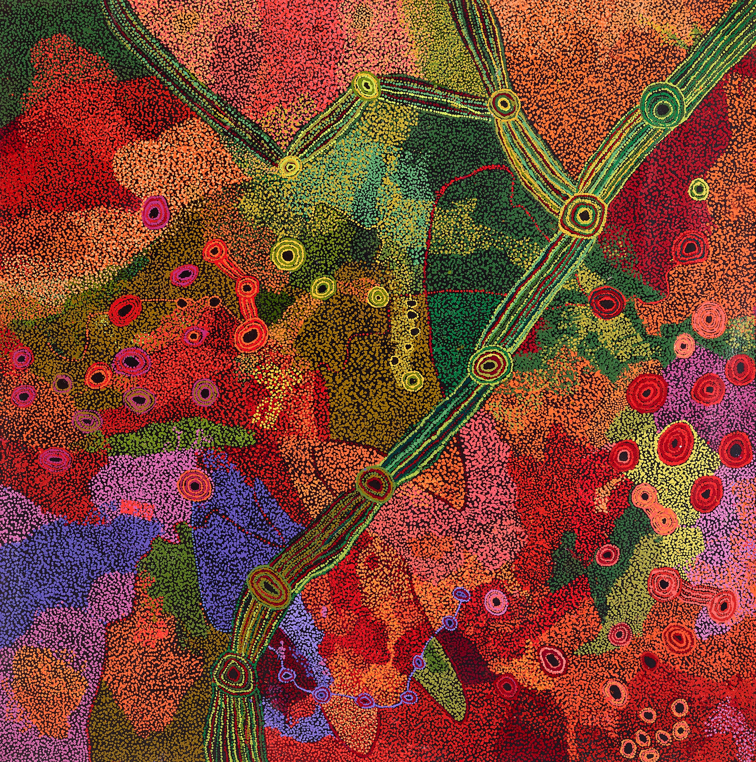 This work is accompanied by a certificate of authenticity from Tjala Arts, Amata which states in part: ‘Sylvia has painted the Seven Sisters Story. This is a Tjukurpa Story (Creation Story) about the constellation of Pleiades and Orion. The sisters are the constellation of Pleiades and the other star Orion is said to be Nyiru or Nyirunya (described as a bad or lusty man). Nyiru is forever chasing the sisters know as the Kunkarunkara women as it is said he wants to marry the oldest sister.’