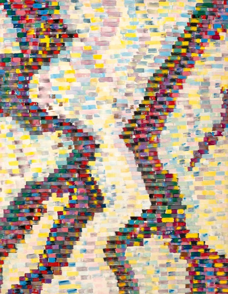 ‘From the late 1950s, Richard Larter produced a series of provocative Pop images based on the nude in aggressively erotic poses. He used a technique of drawing with a hypodermic needle filled with paint, however this linear style changed in the mid 1960s to a commercial art Popo style with simple areas of flat colour and clear crisp outlines and increasing emphasis on patternmaking between the figurative images. In the late 1970s Richard Larter began to concentrate on purely abstract works, of which Shift is a good example. The horizontal brush and “squeegeed” bands of paint are analogous to a musical score that can be read from left to right, with the “shift” of emphasis moving vertically in the construction of the work.’1