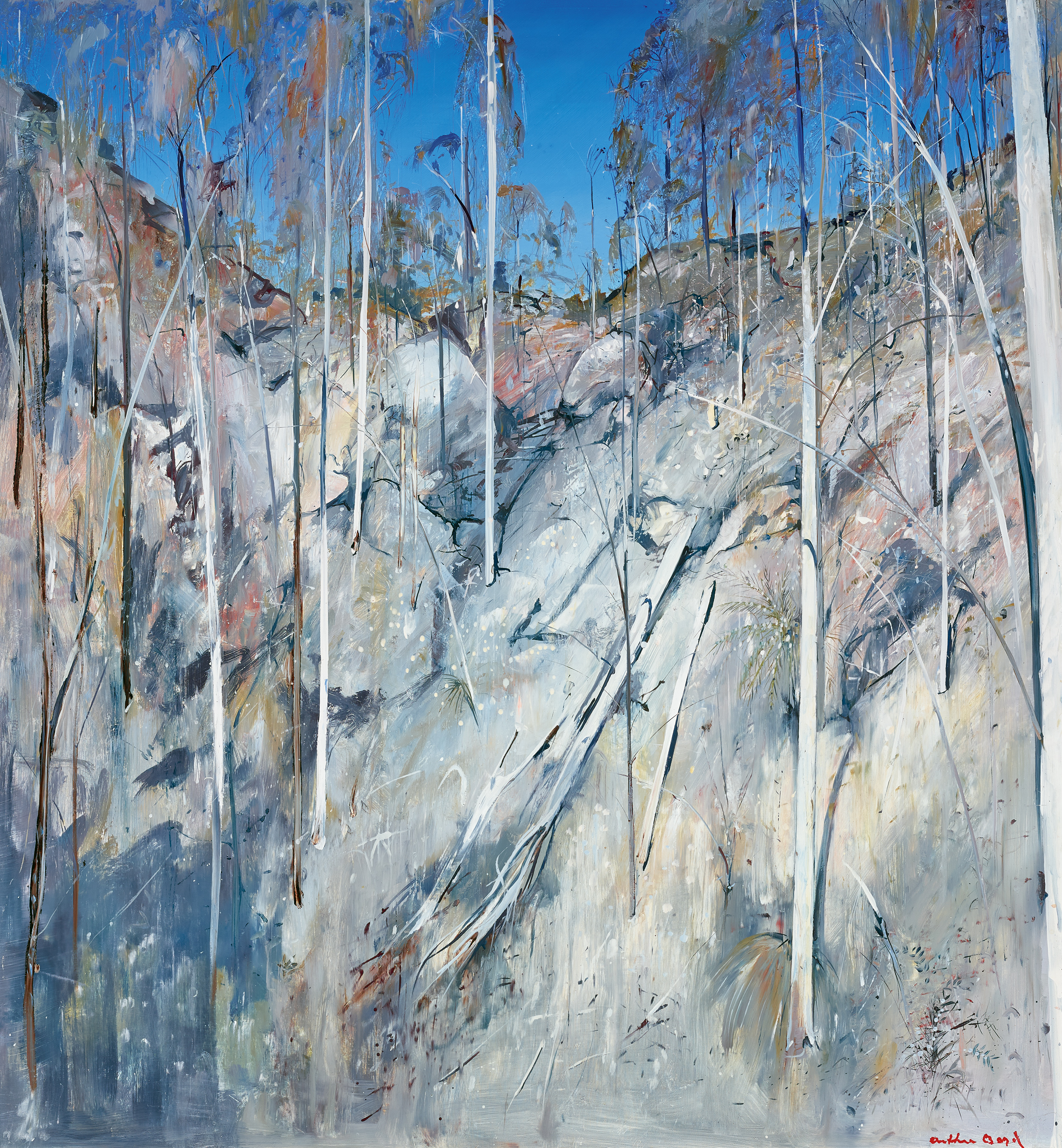Eager to rediscover his roots, his 'Australianism', after more than a decade abroad, in 1971 Arthur Boyd returned to Australia to take up a Creative Arts Fellowship at the Australian National University in Canberra. Over that blazing summer of 1971 – 72, Boyd and his wife Yvonne were invited by the Sydney art dealer Frank McDonald to visit Bundanon for the weekend, a home he shared on the south coast of New South Wales with art historian Sandra McGrath and her husband Tony. Here the artist’s joyful rediscovery of the Australian bush with its stark contrasts and clarity of light was nothing short of an epiphany, and thus in 1974, Boyd purchased the nearby property Riversdale on the banks of the Shoalhaven River. Once again the magic of the dour, untamed Australian landscape became the impetus for his art, and over the subsequent twenty-five years until his death in 1999, Boyd would dedicate himself almost exclusively to capturing the myriad moods of the Shoalhaven in images that are today imprinted upon the national psyche as some of our most beloved and iconic.