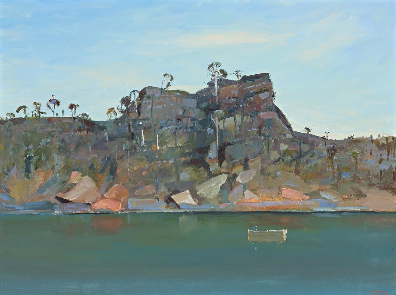 Shoalhaven River with Boat, c.1980s is a pure landscape, celebrating the unspoiled bush, completely removed from urban life. The piercing blue of the sky above the still waters of the river, creates a scene that ‘glow[s] with well-being, joy and a sense of youth’.2 The boatman, quietly drifting in the sunshine, is dwarfed by the landscape surrounding him. Boyd uses scale to great effect, with the dramatic rock face and sweeping sky conspiring to press Boyd’s ideas about our place in the landscape. Local of scene, yet national in imagery, Shoalhaven River with Boat, c.1980s is unquestionably Australian in colour, light and atmosphere. As Sandra McGrath describes: