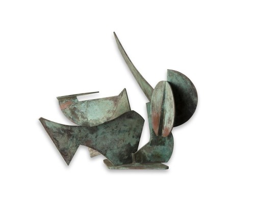 The late James O. Fairfax responded to the tense and balanced composition of Shouting Angels, displaying it on a pedestal in the gardens of his weekend home at Bilgola in Sydney’s northern beaches. In this environment, while the curved forms of the sculpture stretched out towards the horizon, the briny breeze created a pale green patina and the work carries this Verdigris surface proudly. The constantly evolving nature of outdoor sculpture was something that King enjoyed, declaring in 2006: ‘Multidimensional objects look different from every angle. The exciting thing about outdoor sculpture is the change with the light, the weather ... everything is in constant flux. It becomes almost a living entity’.2