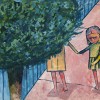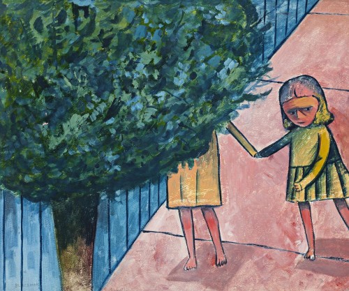 Blackman was born in Sydney where he worked for a while as a cadet cartoonist for The Sun newspaper. Following his marriage to the Brisbane-born Barbara, the family moved into an old coach house and loft in Chrystobel Crescent, Hawthorn, in 1951. Already friendly with the artists Danila Vassilieff, Joy Hester, Laurence Hope and Sidney Nolan, Blackman converted the loft into a studio. On daily walks, he discovered that ‘we were surrounded by thousands and thousands of schools and schoolgirls’2 and soon covered the walls with his paintings and drawings, adding to them every day in a frenzy of work. Bearing distinct linear qualities reminiscent of his previous cartoon work, Blackman also utilised strident colours which matched the mood of the local contemporary art scene still affected by ‘the disturbed years that followed World War II (where) change and disorder were in the artistic air. This was a period in which pastoral harmony and tonal recession were challenged by an expressionism which stirred up the look of things, even seemed to court downright ugliness’.3 Using a similar tactic to other paintings in the series, Blackman upsets the perspective in The Sisters through the use of a sharply angled directional line, seen also in The Crossing, 1952; Schoolgirl at Kooyong, 1953; Prone figure, (1953); and the drawing Schoolgirl and Man, 1952. Set against a ground of acid pink, anxiety pervades the side-long glance of the smaller girl as she leads her companion into the blanket coverage of the tree’s foliage, a possible allusion to Barbara’s blindness and her increased need for protection and physical guidance.