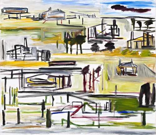 signed, dated and inscribed with title verso: TITLE: “Six “Houses” One Shed” / Artist: / Ken Whisson / Title: “Six Houses, One Shed” / Painting: 7/9/2002 & 1/1/03 / & 27/8/04 / …