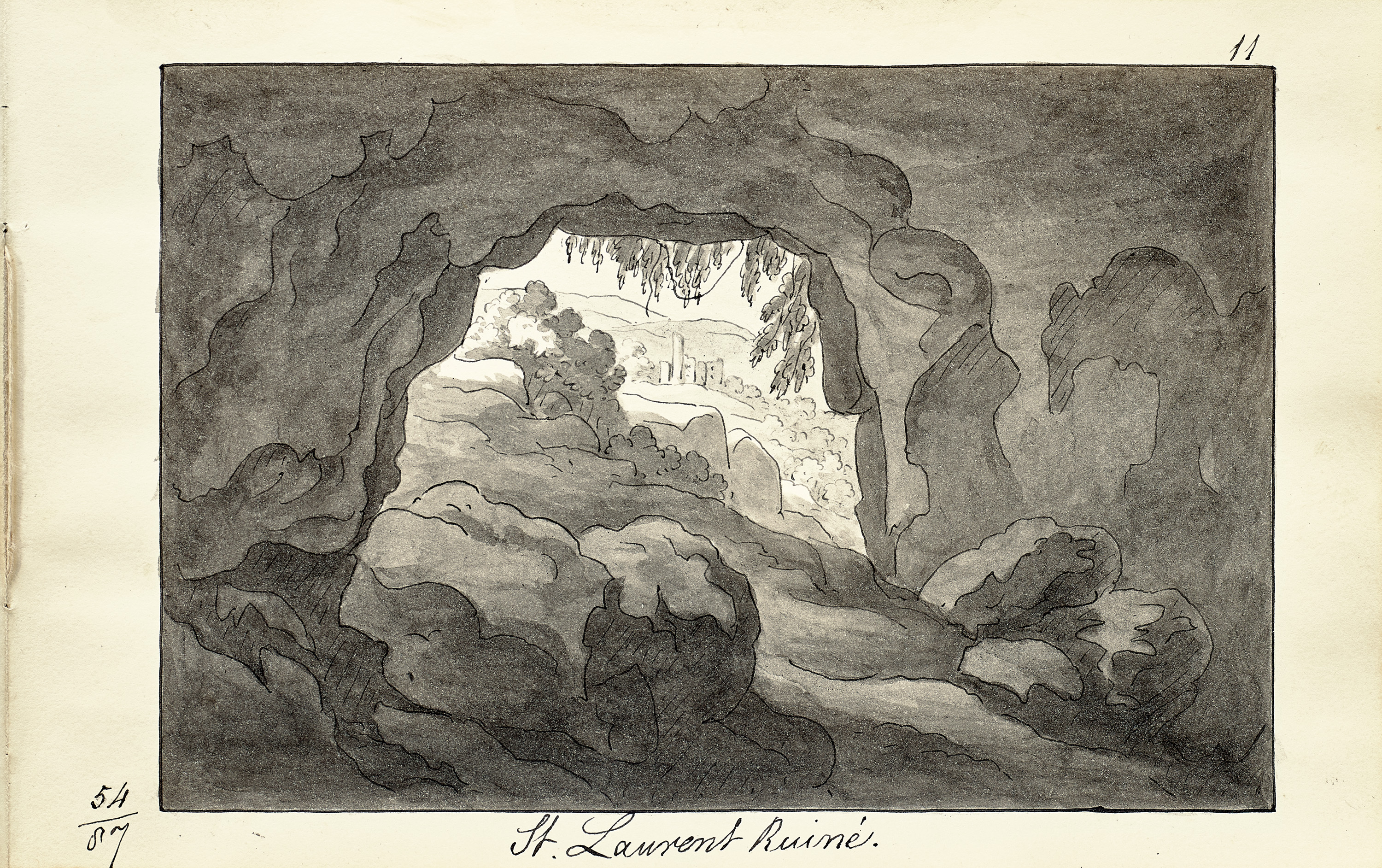 Yet John Richardson is not known to have visited Italy. Instead, the numbers at the lower left of each drawing correspond with sketches in one of the 104 sketchbooks John had brought with him to Van Diemen’s Land. John is known to have been an inveterate sketcher and traveller, often fitting multiple sketches per page. His pupil Edward Price wrote: ‘His knowledge was almost entirely derived from the Study of Nature and not from Works of Art. His numerous Sketchbooks are full of Indian Ink drawings made at all hours… Nothing escaped his observation and he never lost an opportunity of noting down anything that was worth remembering.’3 During 1818 John had travelled to Italy, seeing in the flesh picturesque views and edifices that he would have previously only studied in engravings and other tourists’ art. His only surviving Italian sketchbook, Sketchbook 87, is held by the Tasmanian Museum and Art Gallery, Hobart and records some of the evocative landscapes, churches and Roman ruins that he had seen. It is well known that John called upon his sketchbooks throughout his life: in 1835 at Patterdale, for example, he painted My last view of Italy, looking from the Alps over Suza (Art Gallery of New South Wales).