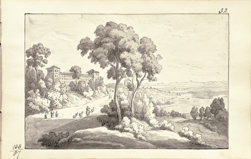 This small sketchbook draws upon the talents and activities of both artists. It is one of the extant examples showing John Richardson’s close artistic relationship with his father, and the vital role that sketching, copying and re-using earlier visual records played before the development of photography. The book contains thirty-nine (previously forty-four) small monochromatic landscapes – the features outlined in pen and ink and enhanced with even tonal washes, which evoke the atmosphere and luminosity of the Italian vistas depicted. A hand-written index, titled Views in Italy, provides locations for the topographical vistas: St Peter’s in Rome, Lake Nemi, the Taro River, Suza and so on.2