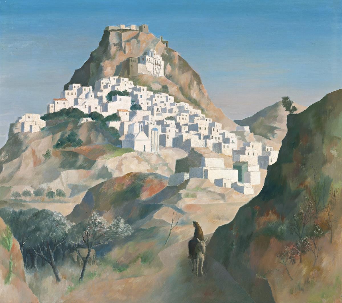 At first glance, this work is a simple landscape painting, an expression of the enduring beauty of the Greek countryside. Closer attention will reveal the silhouette of a hooded figure atop a donkey in the foreground, the viewer’s eye drawn down to its presence by a stark jutting edge of the mountain in the lower right hand corner.