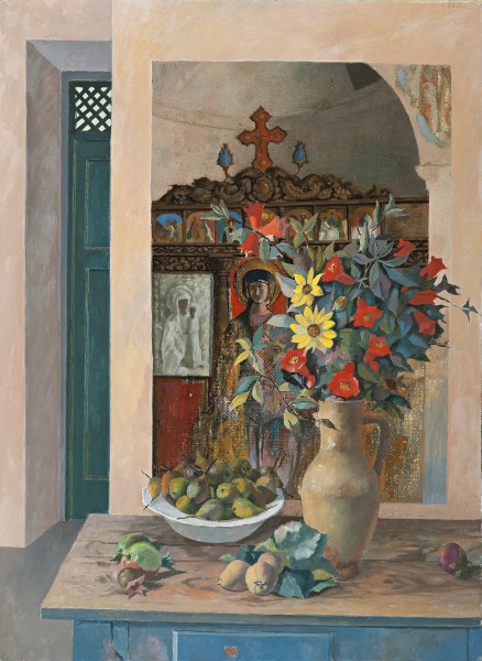 The features of the picture on offer were used in various paintings, portraying the same door, interior architecture and table of the homely cottage. Skyros Interior is indeed a mirror image of Still Life with Angel Fresco, c. 1971-72 and Fruit and Flowers with Fresco, c.1967-68, both of which feature the same wooden table and the aqua door, whilst the vase of flowers and the bowl of figs in the latter work are replicated exactly in Skyros Interior.