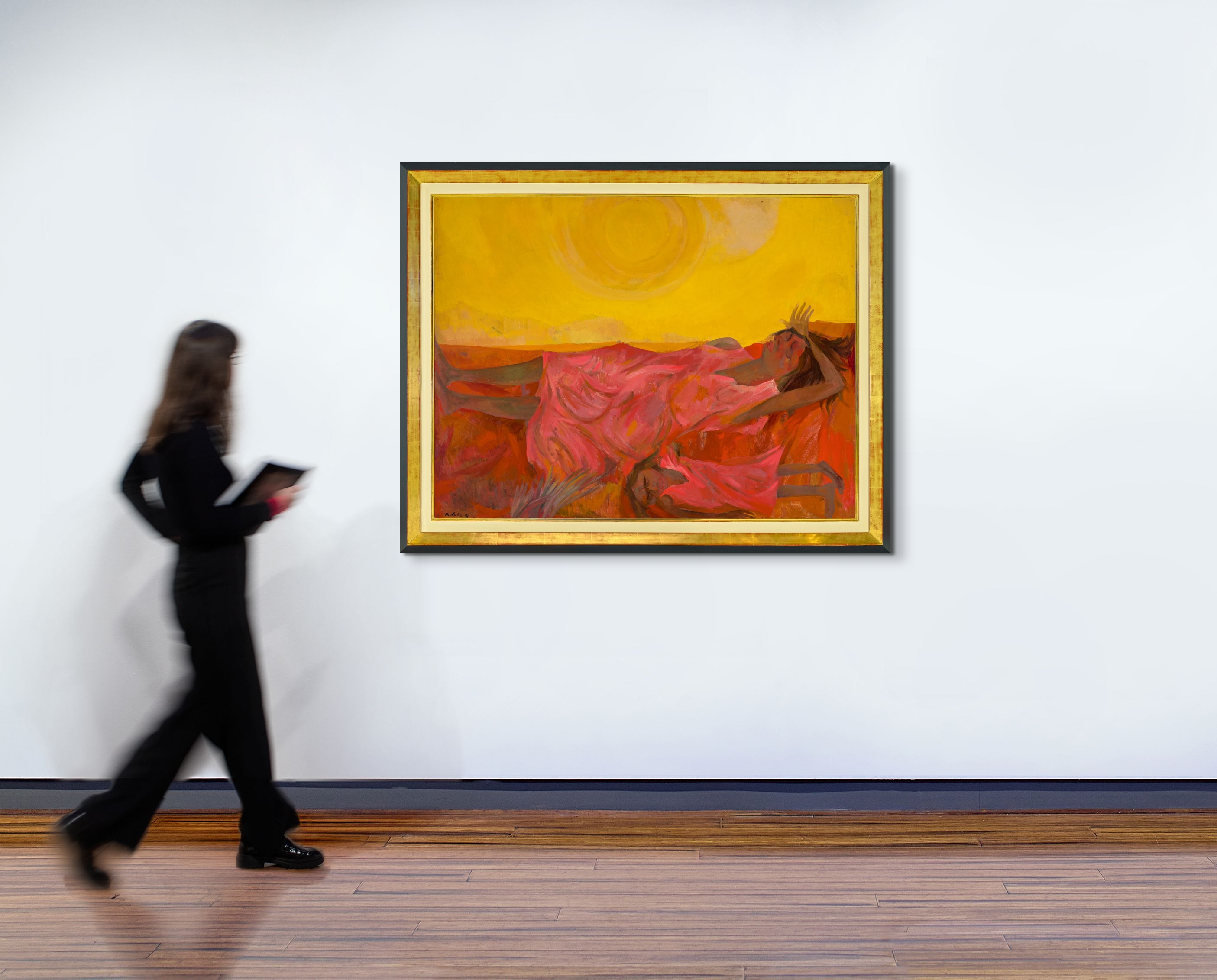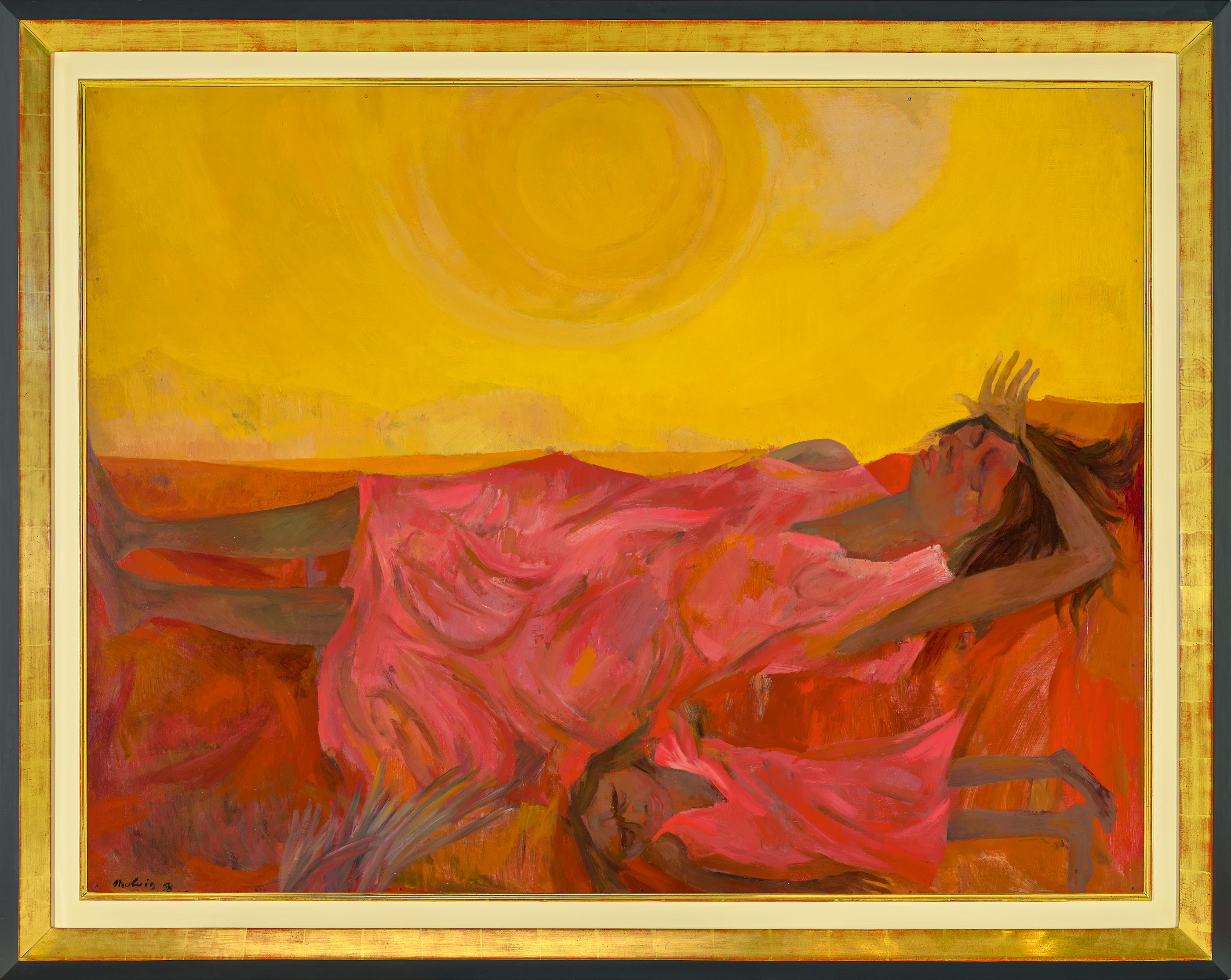 Sleeping Aboriginal Woman and Child attracts an extended analysis in Betty Churcher’s authoritative monograph Molvig: the lost Antipodean, from 1984: ‘The anthropomorphic curves and furrows (in this painting) … have been given specific human form, and like the legendary women of the Aboriginal Dreaming, they seem on the very point of metamorphosis, when their bodies will be converted forever into features of the landscape. They could also be a metaphor for the desert: the arid land that stretched out like a baited trap, set with opalescent colour to seduce the eye.4 Churcher also recorded that the letters ‘EO’ which appear next to the signature are the artist’s shorthand for his use of enamel and oil paints in this work.