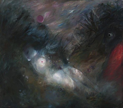 Sleeping Nude has its genesis in Boyd’s Bride Series, the white of the wedding dress and red soldier’s jacket, voyeuristic fixations and the like. Later in London, its powerful companions were to include Bridegroom in a Black Creek, 1960, which was once in the collection of Sidney Nolan. Another, the magnificent Figure in a Landscape (Nude Washing in a Creek III), 1961 is in the collection of the Art Gallery of New South Wales, Sydney. Although Eros is more subdued in Sleeping Nude 1962, its sensuous appeal embraces the imagery, colour and the very application of the paint itself. The balance between stillness and movement, the primal setting and purple moon hint at another Eden, figures independent yet fused with the landscape. Flame-like light flickering across the body invitingly adds to its delicate yet ravishing beauty, sleep and the dreamy mood enhancing the brilliant imagery drawn from the subconscious. As has been noted by several scholars, in this and other paintings of the series, that Boyd created a new concept and image of the goddess of love and beauty, a Venus drawn from and suited to the twentieth century.