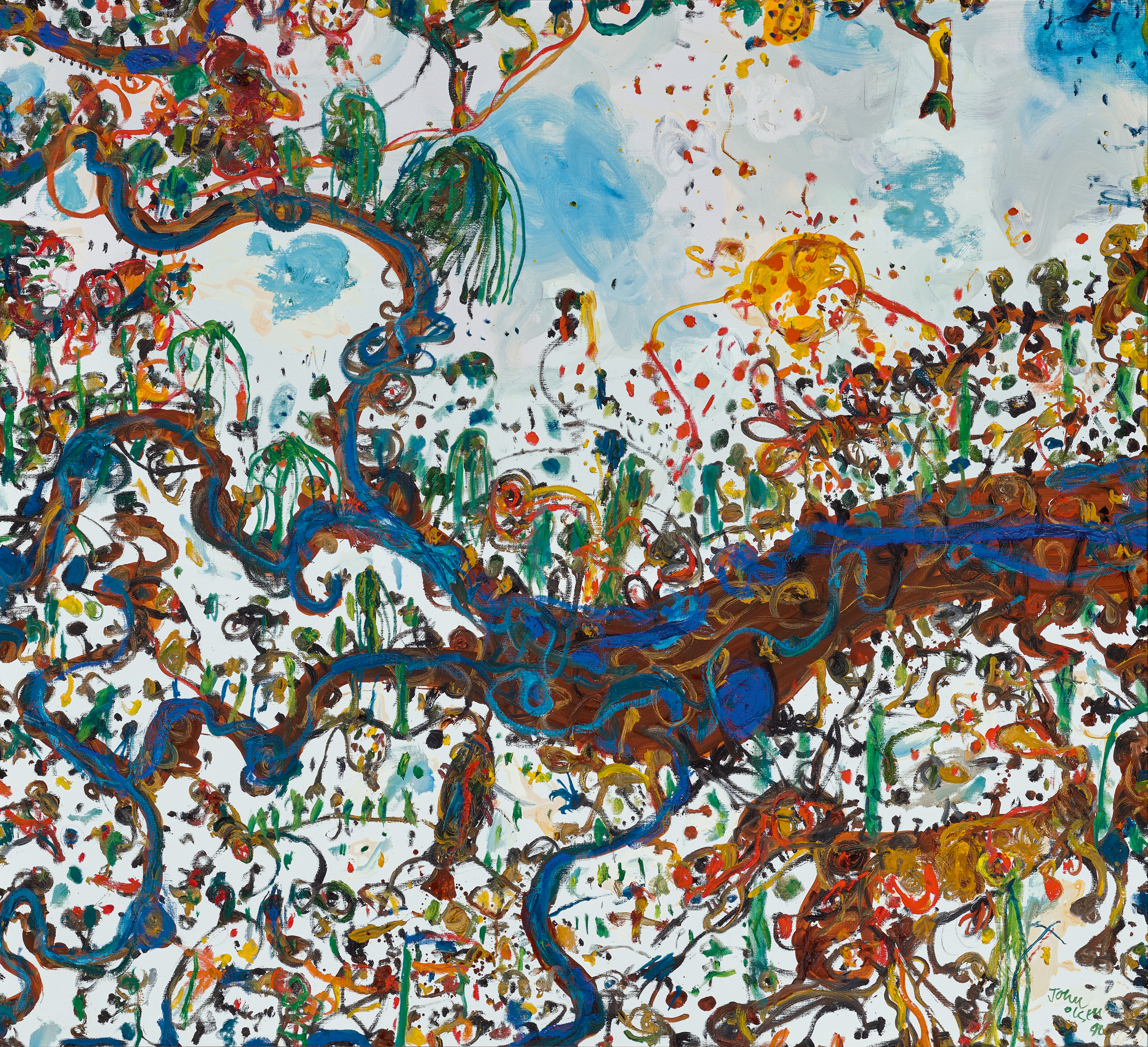 In Small Streams Running into a Big River, 1990, a series of vivid blue lines meandering across the canvas depict the river and tributaries of the title. This dancing, calligraphic line emerged early on in Olsen’s career – and has remained a key element of his pictorial language – growing out of Paul Klee’s notion of drawing as ‘taking a line for a walk’. Olsen extended the concept however, taking his line – whether drawn or painted – on a walk through the landscape and using it to record the experience of being in the natural environment rather than just looking at it.2 Olsen’s imaging of the landscape acknowledges the diverse habitats which are incorporated within it and he represents plants, animals and insects as vital elements of a complex and interconnected whole. Here, alongside the various watercourses and their riverbanks, we see a variety of plants painted in rich shades of green, and a visual cacophony of other dots, daubs and squiggles which express the living energy of this environment. Although he adopts a bird’s-eye view to depict the river and streams, beyond their boundaries we seem to be looking up, towards the open sky, in a complex composition that defies expectations of pictorial logic.