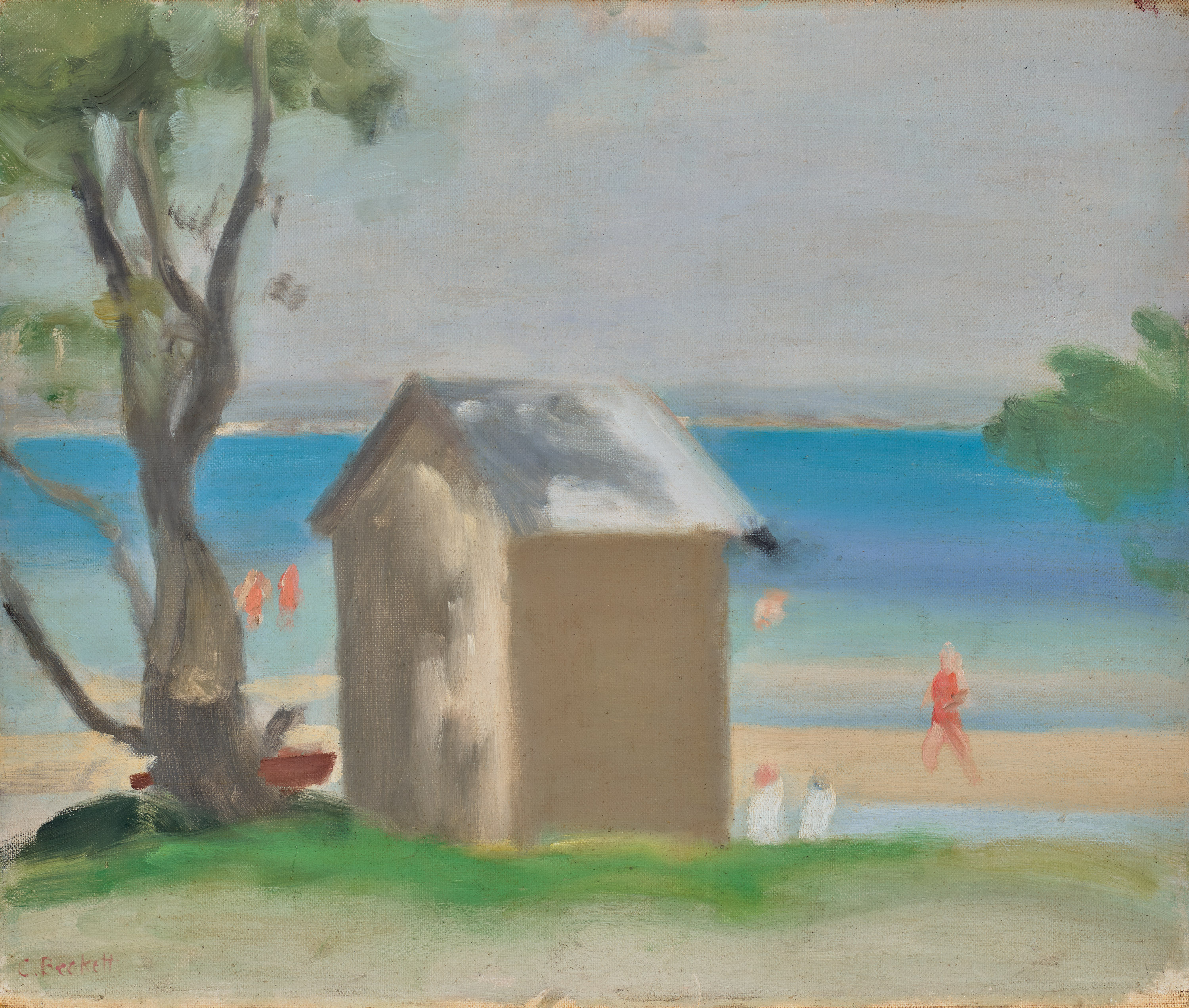 bears inscription verso: “THE SOLITARY BATHING BOX” / BY CLARICE BECKETT. 10 guineas – / THE MELDRUM GALLERY / (J. H. MINOGUE) / 127 QUEEN ST / MELBOURNE