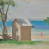 Although she travelled much within Victoria, Beckett’s home base was Beaumaris on Port Phillip Bay and she painted the region ceaselessly. Resisting her colleague’s suggestions that she should travel abroad, she argued that ‘I have only just got the hang of painting Beaumaris after all these years, why should I go somewhere else strange to paint?’4 Numbers of these bathing huts were clustered on the foreshore during Beckett’s lifetime, but many were destroyed through a series of tremendous storms starting at the end of 1934. As such, it is hard to exactly situate the subject of The Solitary Bathing Box but its outlook on the long expanse of the Mentone cliffs with the hint of a headland to the left suggests that it may have been sited at her local beach on Watkin’s Bay. The hazy summer sky and the jaunty red bathing suit of the striding figure indicates a hot, sunny day - the colours of which radiate through the waters to the right of the hut, painted by Beckett in striking bands of violet, blue and soft ochre.