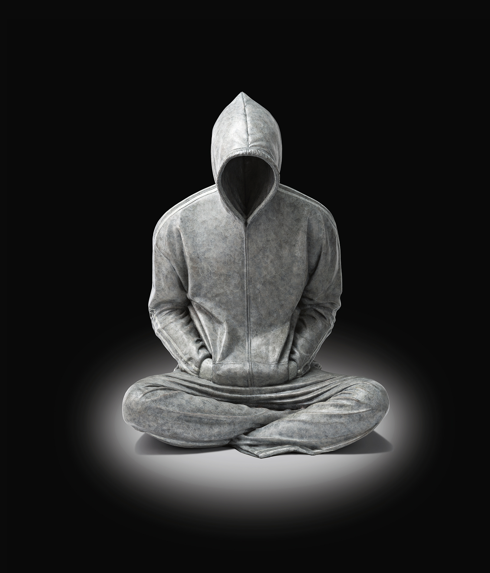 Seton’s preference for the noble materials of sculpture, historically linked to acts of commemoration, endows his works with an elegiac tone. In this context, Soloist becomes a potent monument to contemporary urban ‘otherness’. Dressed in an ubiquitous hoodie, the controversial uniform of urban youth, the figure itself is curiously both present and absent. While the physical presence of the hooded figure is undeniable, stoic and defiant in his weight and immobility, the body within is missing. We are left searching for the physical individual, and in its absence forced to project our own identity onto its sculpted form. Lending conceptual depth to Seton’s technical prowess, this corporeal absence elevates the figure of Soloist to a collective symbol. It is everyone and no-one, a figure of contemporary urban anonymity, yet also expressing the overlooked power and quiet strength of the individual. Cross-legged and unmoving, this cast bronze figure evokes the power of historical acts of individual activism, media images of which have remained present in our psyche.