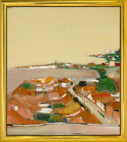 ‘…Suburbia is another important component in the development of the theme on The Great Australian Landscape. The Suburbs, a large oil and a key work included in the 1970 exhibition [Bonython Art Gallery, Sydney, thence Australian Galleries, Melbourne], was repainted in 1982… It depicts an ordinary suburban house – a red tiled roof set behind a real paling fence – looking out to a landscape dotted with more red-roofed bungalows and suburban vegetation. This idea continues to evolve over several decades, with variations on a theme that include Red roofs with Palm Trees (1983)… South Coast after the Rain (1984)… and Study for The Great Australian Landscape (c.1989)… Common to each painting is a palette dominated by reds, oranges and greens that describes the profile of the typical sprawling Australian urban landscape.’6