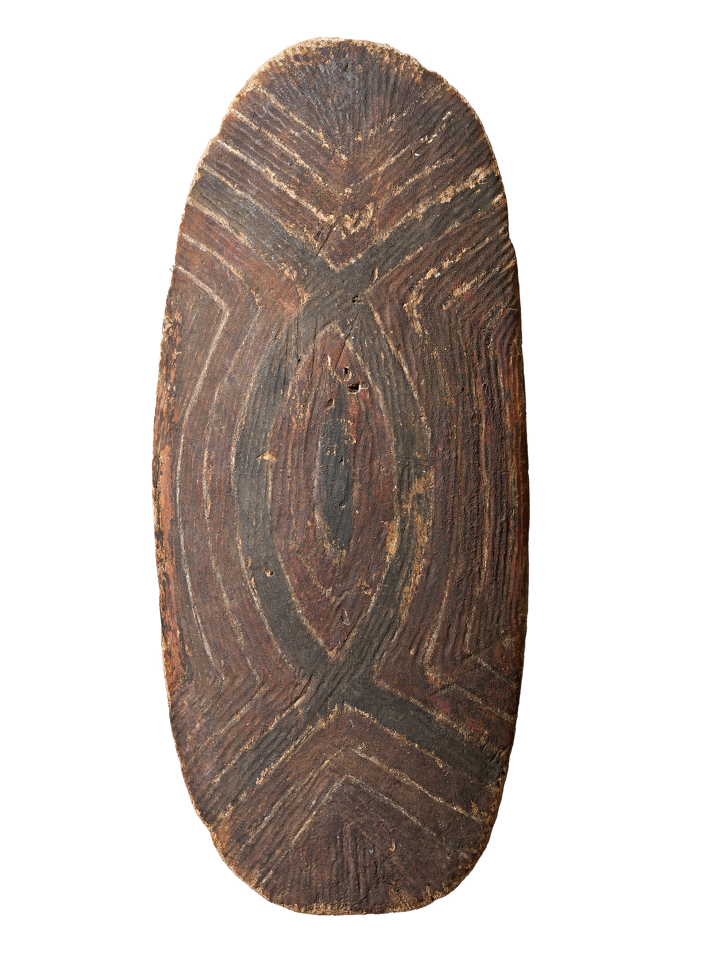 carved and shaped hardwood with geometric designs infilled with natural earth pigments, the reverse with a deep cut lug handle
