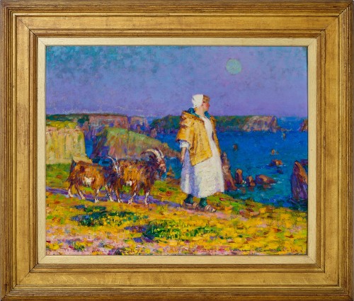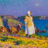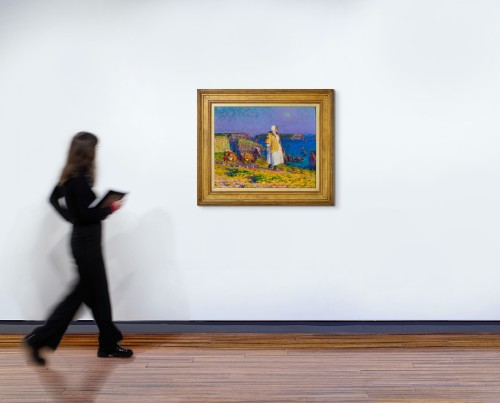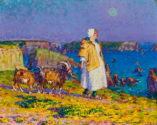Russell continued to be inspired by Belle-Île, writing to Rodin in 1890, ‘the colours completely bowl me over. On some days here it’s ravishing but impossible for my poor palette.’9 His mastery and expressive use of colour is on full display in Souvenir de Belle-Île, 1897. In the foreground a figure wearing traditional Breton dress leads a pair of goats along the cliff top, brilliantly illuminated by a full moon that sits high in the sky. The dramatic, predominantly purple sky appears to glow and the sensation of the strange ‘in-between’ light of dusk, which teases the eye and makes it hard to focus clearly, is skilfully rendered. The crisp white of the figure’s dress and cap provides a central focal point, highlighting the vivid colours of the surrounding scene: the yellow and greens of the grassy ground, the purple shadows cast by the figure and her goats, and the deep blue tones of the ocean – described by Monet as ‘an improbable sea of colours’10 – with its distinctive rocky outcrops. While Russell is renowned as a bold and inventive colourist, this is surely one of the most dazzling examples of his work.
