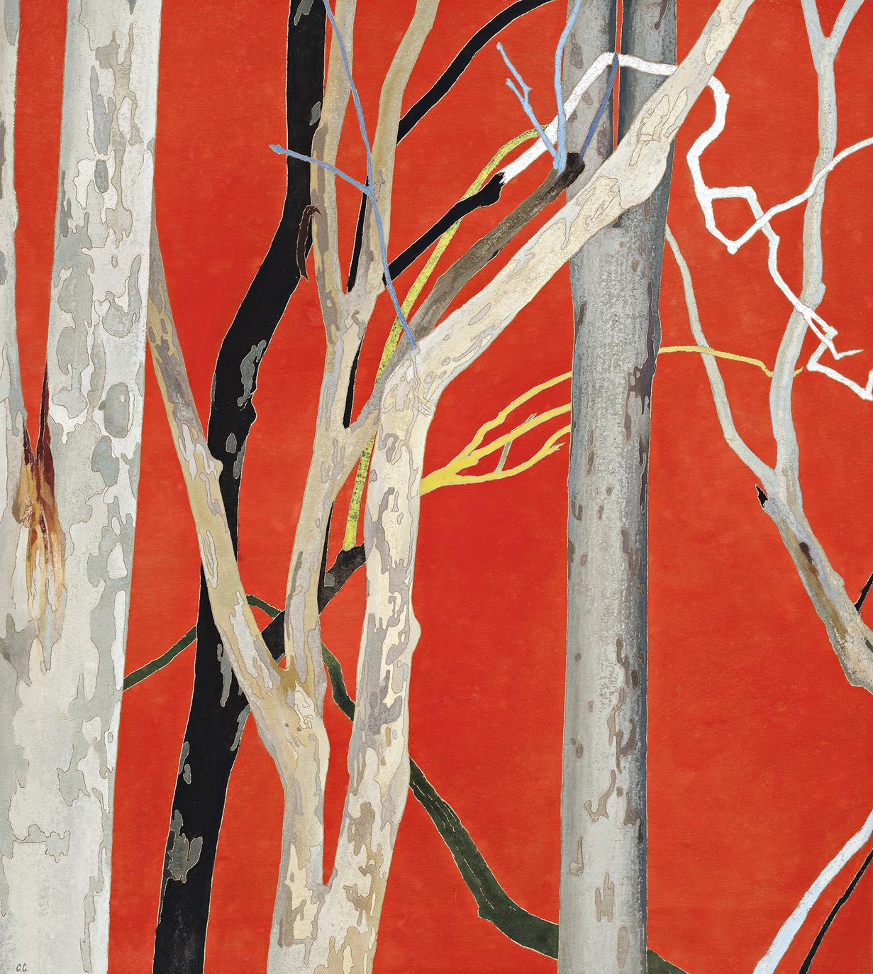 The densely patterned, naturalistic version illustrated in Campbell’s monograph, is a view from the verandah of the Stella James House in Avalon, designed by Walter Burley Griffin, in which she lived over an extended period of time, including the summer of 1999 – 2000. Her time in this heritage-listed residence also led to the creation of the masterful Walter Burley Griffin House, 1999, featuring its unmistakable bank of Art Deco folding windows. This house, hidden within the lush bushlands of Pittwater in Sydney’s Northern Beaches, is bordered by tall gum eucalypts and angophoras which cover the steep slopes surrounding the cottage. With keen attention to detail and composition, Campbell chose the Eucalypts, including one charred branch, as the heroes of the composition, returning to these to create two more woodblocks and prints with a simplified background of solid colour and a slightly wider field of vision.