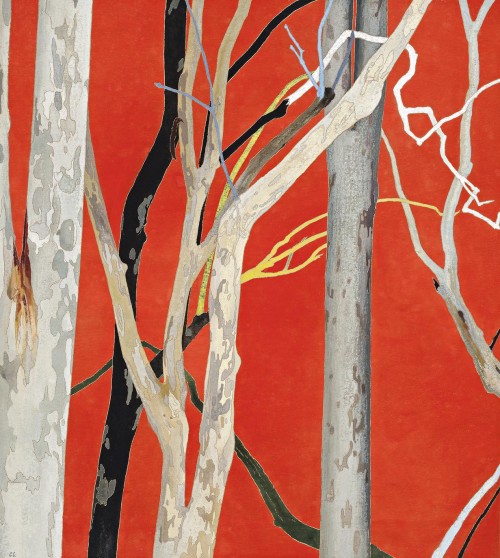 The level of detail, respect for decorative design and refinement of colour all endow Campbell’s familiar domestic and landscape views with an intimate originality. A tightly cropped view, Spotted Eucalypts, Orange is a moment of close attention that the artist extends to the viewer – whose breath is restricted for fear of disturbing the peace of this serene, shared moment.