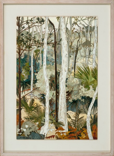Framed in the lower corners by pinnated leaves of cycads and browning ferns, the airy composition of Spotted Gums is dominated by the strong vertical lines of the trunks of these gum trees, which tower way beyond the limits of our vision. In the foreground, a wide and mottled eucalypt trunk bisects the composition cleanly from top to bottom. It draws the viewer into Campbell’s view and directs the eye delicately throughout its dense bush, amongst the trunks, deep indigo shadows, and beyond, into the rising sea mist and pale open sky above the horizon line.