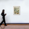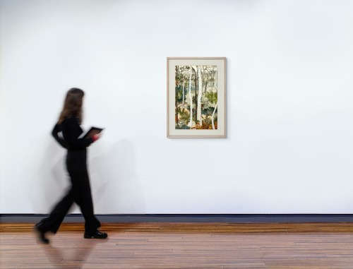 While tall, Campbell’s view of this eucalypt forest is contained, a small fragment of the vast view that the artist had enjoyed from where she stood. The artist’s unusual and painstaking practice of painting her woodblocks with watercolour, using a technique similar to cloisonné, lends a chalky, mottled texture to both finished artworks (block and unique print). The inconsistencies and velvety textures left on the block’s surface after the printing process, provide a tactile evocation of the mottled bark and rough surfaces of its subject matter. The clean incised outlines of tree trunks and detailed clumps of leaves dissolve into the damp and shady depths of the forest, keeping a sense of mystery within its detailed naturalism. Campbell’s prints and blocks display a fragment of her reality, leaving clues to hint at what lies beyond the frame. With reverence, Campbell translates the ancient grandeur of Australia’s native flora, and in evoking its unique beauty, silently entreats the viewer for its continuing respect and preservation.