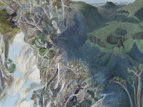 Springbrook and Numinbah to Mt Warning, 1996, is a classic example of Robinson’s landscape painting. He flaunts his skills as a colourist and again uses his device of multiple view points within the one picture plain. He also uses vastly different techniques when applying the paint in the major passages of the painting. The mediative application of the deep greens and granite greys in the right side of the composition are used by the artist specifically to depict the ancient features of the landscape and evoke his timeless quality. In the left passage of the painting, Robinson deploys upbeat staccato brushwork, which brings a present day contemporary feel to the picture. The forest of Antarctic Beech trees depicted, within the time frame and context of the painting, amount to new growth and the passing clouds bring an ephemeral element to the work, which further presses the notion of time passing.
