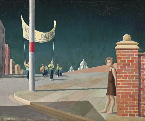 With the twin domes of the St Kilda Baths forming the central focal point, a political rally marches down the elevated roadway of Jacka Boulevard. To the right, next to the wall of the old footbridge, a young woman seems more interested in the artist than she is in the strident clamor of drums and marchers. It is presumably an incident witnessed during the state election held in Victoria in 1958 though the name beginning ‘Dasbor…’ is an apparent fiction for no delegate with a similar name contested the event.1 Smart has also tinkered with the view as this particular angle of sight does not exist, but his manipulation magnifies the intensity of the drama, structured as ever on the underlying Golden Mean. Interpretation also remains open, a deliberate strategy by the artist who rebutted any attempts to ‘explain’ his paintings. As his friend, the novelist David Malouf, explained: ‘The figures in his paintings puzzle us so much, because they don’t have any real relationship with the landscapes. They are like ghosts who’ve wandered in, from another time. He paints them as if there is some story, some anecdote, and yet there is none. People are teased by this, and search for one’.2 St Kilda is an important precursor for a suite of notable paintings which feature solitary figures in urban settings surmounted by glimpses of the upper levels of distant buildings, such as On the roof, 1961; Trumper Park, 1961; and Coopers Park, 1962. The culmination of the series, Cahill Expressway, 1962, is Smart’s most famous image with its enigmatic one-armed man who likewise stares back at the viewer as an elevated roadway sweeps off to the left. St Kilda was never publicly exhibited, having been sold directly from the studio to Smart’s stockbroker in April 1959, and is now offered for sale for the first time since its last appearance on the market in 1995.