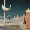 St Kilda, 1959 is the only known image of a Melbourne subject by Jeffrey Smart painted before he moved permanently to Europe in 1963. It comes from a particularly fertile period for the artist as he negotiated his busy life as a much-loved art educator with the ABC with the burgeoning fame that his art had been attracting over much of the previous decade. His imagery already stood in stark contrast to much of contemporaneous Australian art with its exceptional precision and masterly technique, combined with a stark clarity to its vision, where characters seem frozen into ‘separateness’ having stumbled onto a stage set and been momentarily caught in the act.