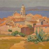 One of Cézanne’s most influential statements was that a landscape painting is not real life; it is an image of real life. He flattened planes, stressed the importance of structure, and interrogated the use of paint. Cézanne’s art was the basis for cubism and in many ways, St Tropez recalls George Braque’s famous Houses at l’Estaque, 1908 (Lille Métropole Museum of Modern, Contemporary and Outsider Art), as Gruner crowds his middle ground with the jostle of houses located near the town square, each reduced to a basic planar form. Importantly, his overall small output of work was due to the ‘considerable time (he spent) in the careful pre-consideration of his subject matter and, frequently, a long time in the execution of his picture.’1 In St Tropez Gruner looks toward the Chapelle de la Miséricorde built in 1645 by a quasi-official religious order called the ‘black penitents.’ His subject choice of houses and the domed bell tower is already a marked change as, prior to Europe, urban buildings rarely featured in Gruner’s paintings (one example being The Bustle of Life, 1914, see lot 26) with stray barns and rustic cottages appearing instead. In St Tropez, however, they are the focus, a radical departure for such an artist. Large buildings, when they do appear in his earlier work, are mostly used anonymously as distant zones of delineation; they have no presence other than providing perspective. In reality, the Chapelle’s tower is glazed with green and gold tiles but here, Gruner reduces it to two small sections of soft brown. The distant mountains over the bay are likewise simplified to two solid tones of blue, echoed by a further two roof lines of purpled shadow.