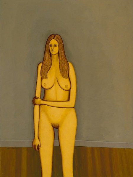 Painted in his studio with its timber floorboards and unadorned walls, the late nudes typically depict a woman (occasionally two) with various props; a chair, sometimes draped with the model’s discarded robe, and more often than not, a Persian carpet. Rendered in intricate detail, the carpets have a prominent role in Brack’s nudes, as do the floorboards, which often tilt vertiginously, as if everything they support might fall over at any moment. Eschewing all of these familiar accoutrements, Standing Nude, 1970 is one of Brack’s most austere paintings. The focus is on the young woman who stands at the very front of the picture plane, one arm folded across her body holding the other, a gesture which implies some awkwardness but also reinforces the strongly rectilinear nature of the composition. It was included in Brack’s 1971 solo exhibition at the Rudy Komon Gallery, Sydney, alongside Reclining Nude, 1970 (Art Gallery of South Australia) and The Fur Coat, 1971 (Queensland Art Gallery/Gallery of Modern Art). While the Bulletin review of the exhibition asked ‘What Has Happened to the Nude?’4, Daniel Thomas looked beyond the surface, writing, ‘In the new nudes he reminds us that we are looking at paintings, not people … Besides the tension between real and artificial, I now think there’s a permanent tension between puritanism and luxury in his work. Spare puritan forms always, luxurious subject matter mostly’.5 Standing Nude was acquired by Rudy Komon and later owned by Ray Hughes, and its provenance, as part of the personal collections of two of Sydney’s most renowned art dealers – both individuals with a very well-trained eye – highlights its pictorial strength and significance within Brack’s oeuvre.