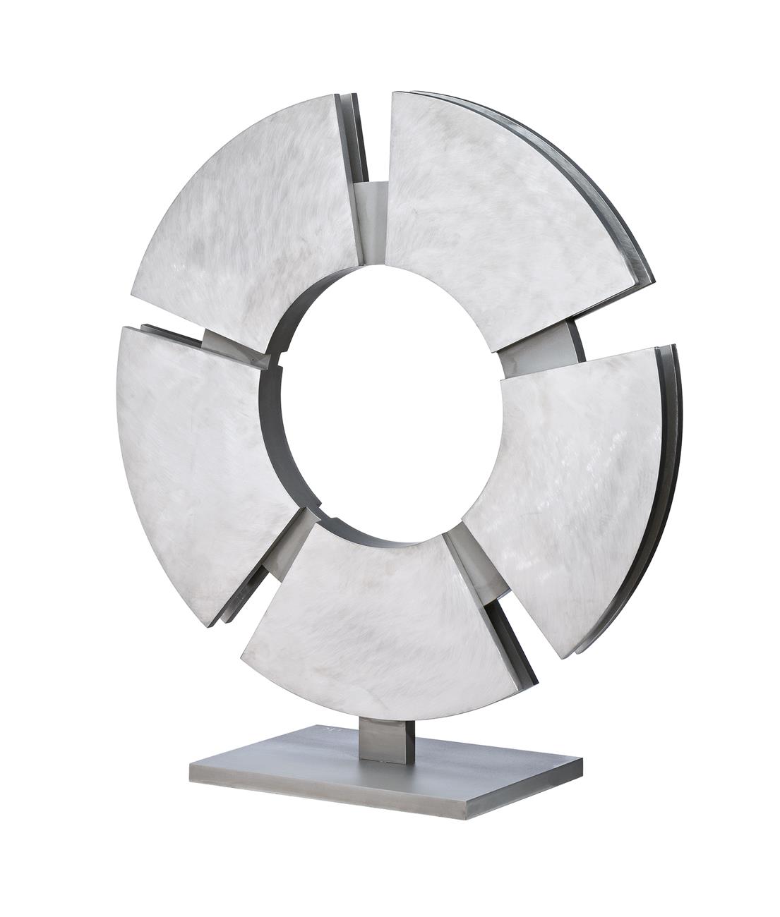 In brilliant contrast to Inge King’s expressive and brooding early assemblages (see lot 37), Stellar Wheel, 2010 glimmers with a futuristic presence. An example of King’s final Celestial Rings series, Stellar Wheel is the product of the convergence of many different lines of inquiry in her oeuvre: the circular form, process-driven art making and expressions inspired by new discoveries in science and technology. Created late in life, many of these works reused elements and compositional structures from earlier sculptures. Stellar Wheel itself is closely related to an unpatinated bronze sculpture from 2002 called Capriccio. Both feature flat segments of a circle, arranged in a fragmented mandala radiating from a central void. It was with youthful exuberance that King harnessed her excitement about the dawn of a new century, and the technological progress that would accompany this transition. She translated her excitement into monumental works featuring sacred geometry from which emanated a spiritual energy, describing the series as ’very positive … life affirming works’.1