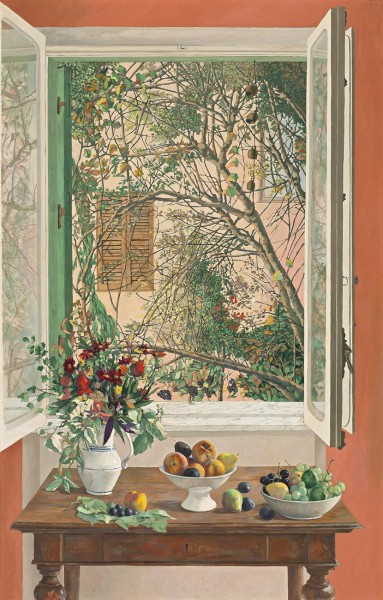What distinguishes this Still Life against a Window is its pictorial richness and the way it appeals to all of our senses. The tone and texture of the scene are carefully observed and faithfully transcribed as O’Brien conveys the coolness of the marble window sill, the flickering reflections on window panes, soft and velvety fruits and feathery blooms. In comparison to its closest related work, Window 2, 1978, which features the same window, this painting is warmer and more complex, counterbalanced compositionally through the placement of a table in the foreground, laden with fresh earthly offerings.