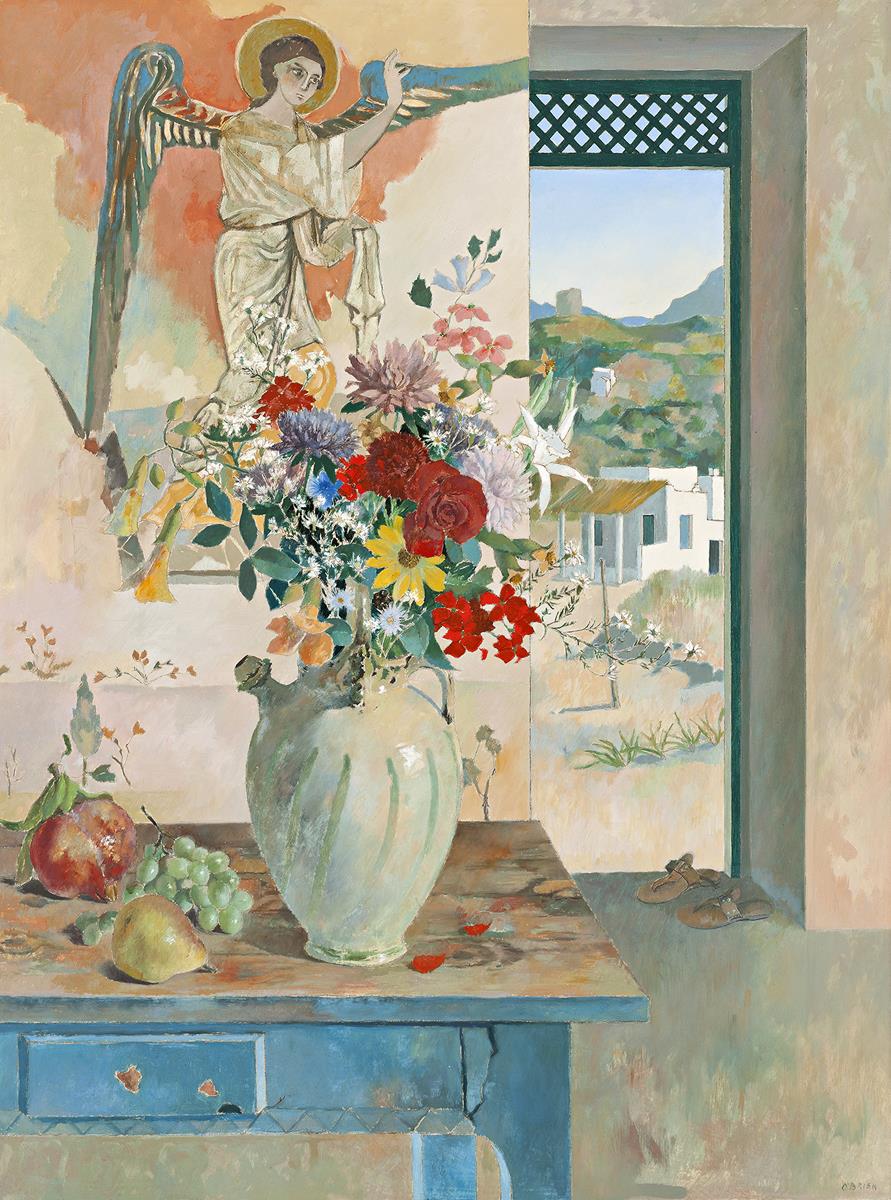 Still Life with Angel Fresco is a joyful expression of O’Brien’s visual awareness and appreciation of his immediate environment, with all the gaiety and verve that modernism allowed. Having shed the static and heavy religious symbolism of his earlier works, O’Brien’s still lives of the 1970s and 1980s exude a joyous luxuriance – an almost baroque exaltation of life’s blessings and fruits. O’Brien’s early religious works bore much in common with early Sienese and Byzantine styles of representation, and in this respect, Sasha Grishin identifies the fresco in this picture as an ‘emotional counterfoil’, a lingering stylistic memento of earlier artistic endeavours.3