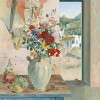 From the vantage point of his fisherman’s cottage by the sea, Justin O’Brien delighted in painting the changing effects of light and colour on the simplest of objects in his Grecian home. Still Life with Angel Fresco, 1972 shimmers with heat and expectant stillness. The soft velvety finish of O’Brien’s oil paint carefully translates the surface textures of each object in his field of vision, from the delicate petals of chrysanthemums in a bouquet, to the skins of green grapes, the worn and cracked leather of sandals in the doorway, and the crumbling plastered surface of the fresco. Every object presented here is imbued with timeless simplicity, of ancient modes of interaction with the landscape, unchanged for millennia – yet interpreted by O’Brien in a blaze of modernist colour and flat rendition of form.