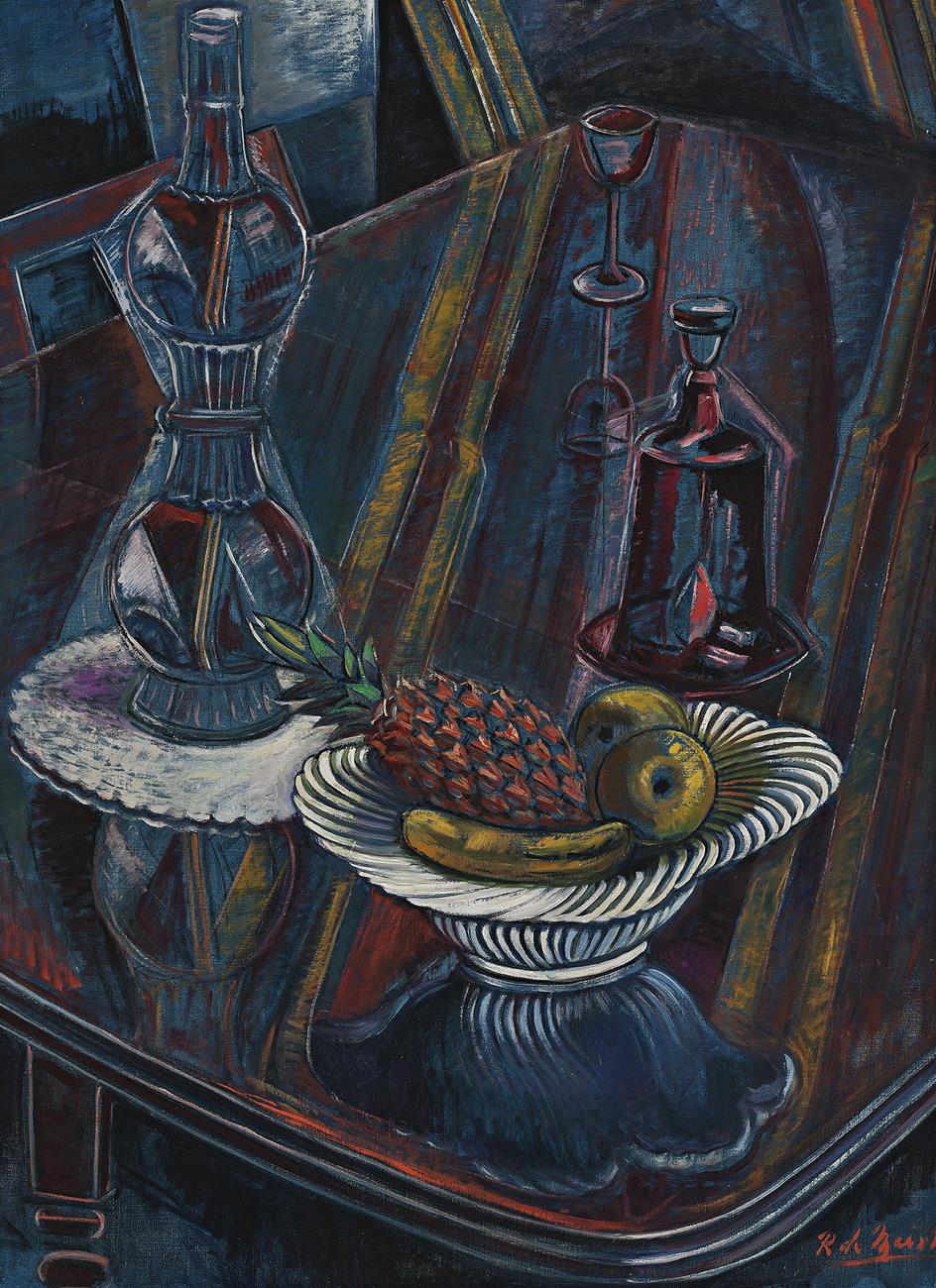In a manner similar to the Italian Giorgio Morandi, de Maistre was a studio-based artist who never had to look far for subject matter. ‘The result is that he looks with fascinated intensity about the ... studio ... and this scrutiny, searching yet affectionate, has made him a kind of intimiste. Each object of contemplation (has) been combined in lucid, close-knit arrangements expressive of the painter’s relation to his surroundings’.3 In Still Life, Bottle and Fruit, de Maistre has orchestrated the reflections within the glassware and the polished surface of the table into an absorbing composition full of angles, directional line and, above all, colour.4 Having developed a personal colour-music chart which he kept secured at the top of his box-palette,5 de Maistre famously claimed he could ‘whistle the tune’ of his paintings; and comparison with one of those charts suggests this painting may have been composed in the keys of E♭ (green-blue) through to G♭ (indigo-violet). Curiously, the painting also exhibits de Maistre’s awareness of other contemporaneous artists in elements such as the striking pineapple and its companion fruits which look like émigrés from a Max Beckmann painting. Rigorous, ordered and above all, highly personalised, Still Life, Bottle and Fruit, is an excellent example of the artist’s mature vision.