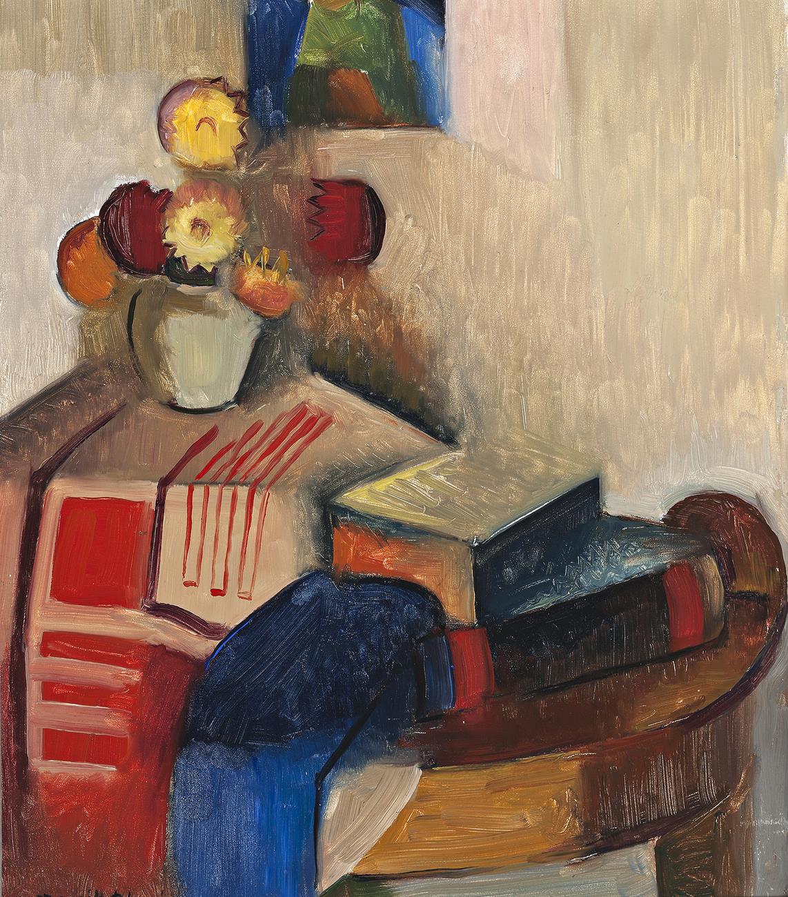 Still Life (Dahlias), c.1929 – 30 features a familiar table-top arrangement of elements – books, a tablecloth (itself bearing a strikingly modern geometric design), and a vase of flowers – and the lower half of a framed picture is visible hanging on the wall behind. But while the subject is traditional, its treatment is far from it, as Black compresses pictorial space and merges some forms with others (the uppermost book and wall for example), introducing multiple fragmented viewpoints into the image. Visible brushstrokes lend the work a painterly energy and the bold colours of Black’s palette – from the royal blue of the draped cloth to the burgundy and yellow of the dahlias – draw the eye around the picture, highlighting the geometry that underpins its composition. This work was exhibited in 1930 alongside one of Black’s best known paintings, The Bridge, 1930 (Art Gallery of South Australia, Adelaide), in her first solo presentation at Macquarie Galleries, Sydney. Confounding one critic with its display of ‘ultra-modern methods’3, the exhibition bewildered another with its interpretation of subject matter ‘in geometrical terms’ and radical ‘adventures in forms’.4