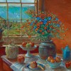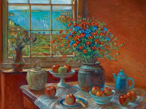 Thus, in Still Life with Harbour View, the various elements are poignantly orchestrated to lead the viewer’s eye and mind through an intimate, deeply personal drama to a tantalising glimpse of the harbour beyond. Paying homage to the great European masters of her métier such as Vermeer, Bonnard, Matisse and Cézanne (the apple motif), as well as her domestic surroundings which continue to provide inspiration, indeed the work reveals the very essence of the artist’s identity; as Barry Pearce aptly notes,