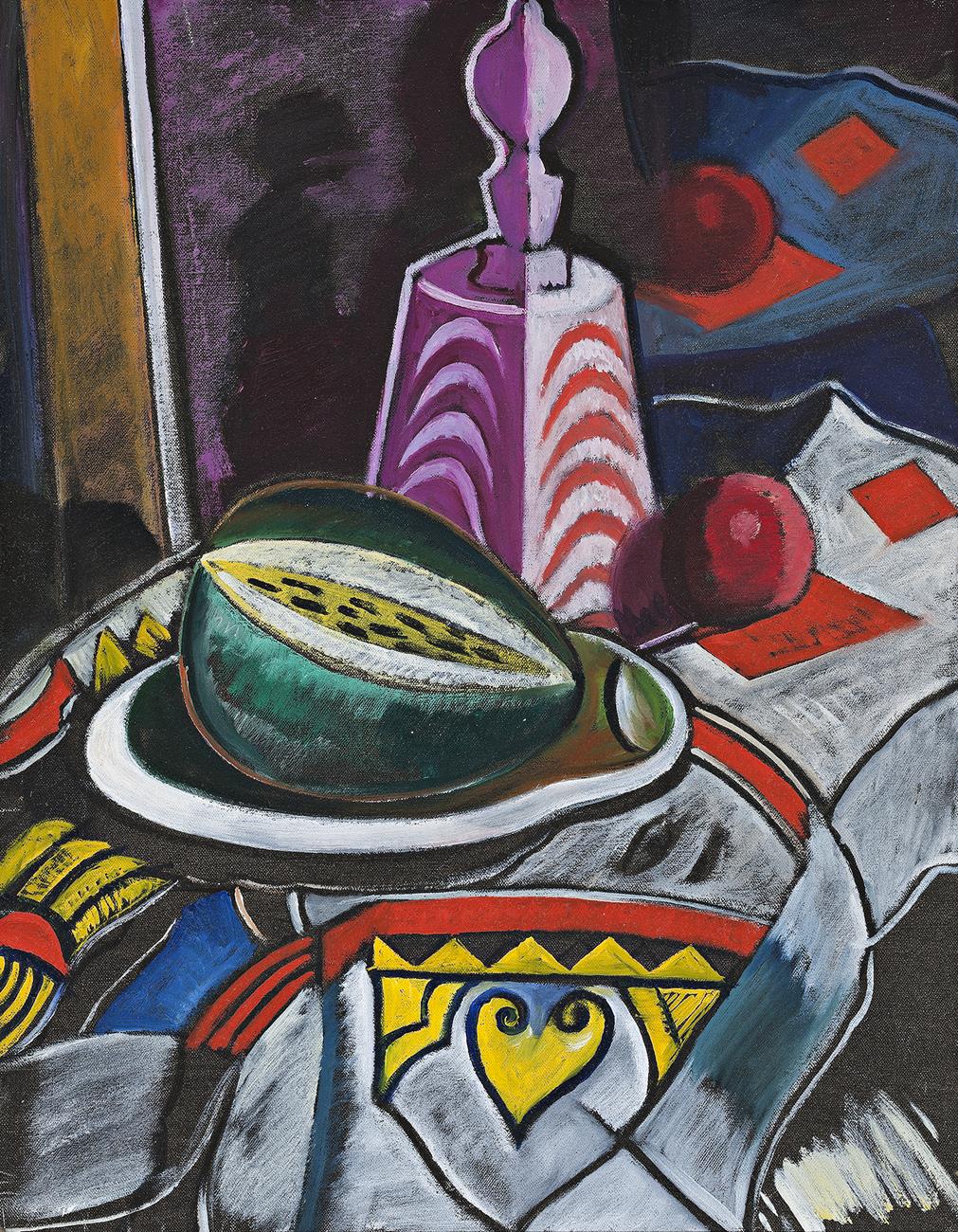 bears inscription on frame verso: “Still Life with Melon & Bell” Painting by Roy de Maistre / stamped with the facsimile of his signature by his Executor Doris de M Fischer