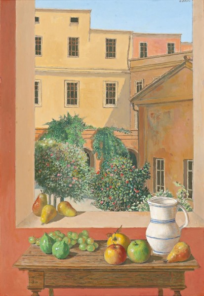Still Life on a Terrace is a carefully considered study, delicately detailed and vibrantly coloured. The vision is of the window of his apartment close to Via Alberico II, within the old city center of the Italian capital, a stone’s throw from the roman Castel Sant’Angelo on the banks of the river Tiber.1 Whilst it is similar in composition to other ‘window paintings’ by the artist – in particular The Window No. 2, 1978, formerly of the David Clark AO Collection – the world beyond the window frame is undeniably Roman, the internal courtyard filled with creeping ivy and flowering fruit trees. The rich terracotta and cream colouring of the facades of the neighbouring buildings also point to its carefully recorded geographical setting. In his last interview with Christine France, published in the revised edition of her monograph, O’Brien expressed his enjoyment of the ‘much better view … which has beautiful trees in the courtyard and from the back I look onto the Nigerian Embassy’.2
