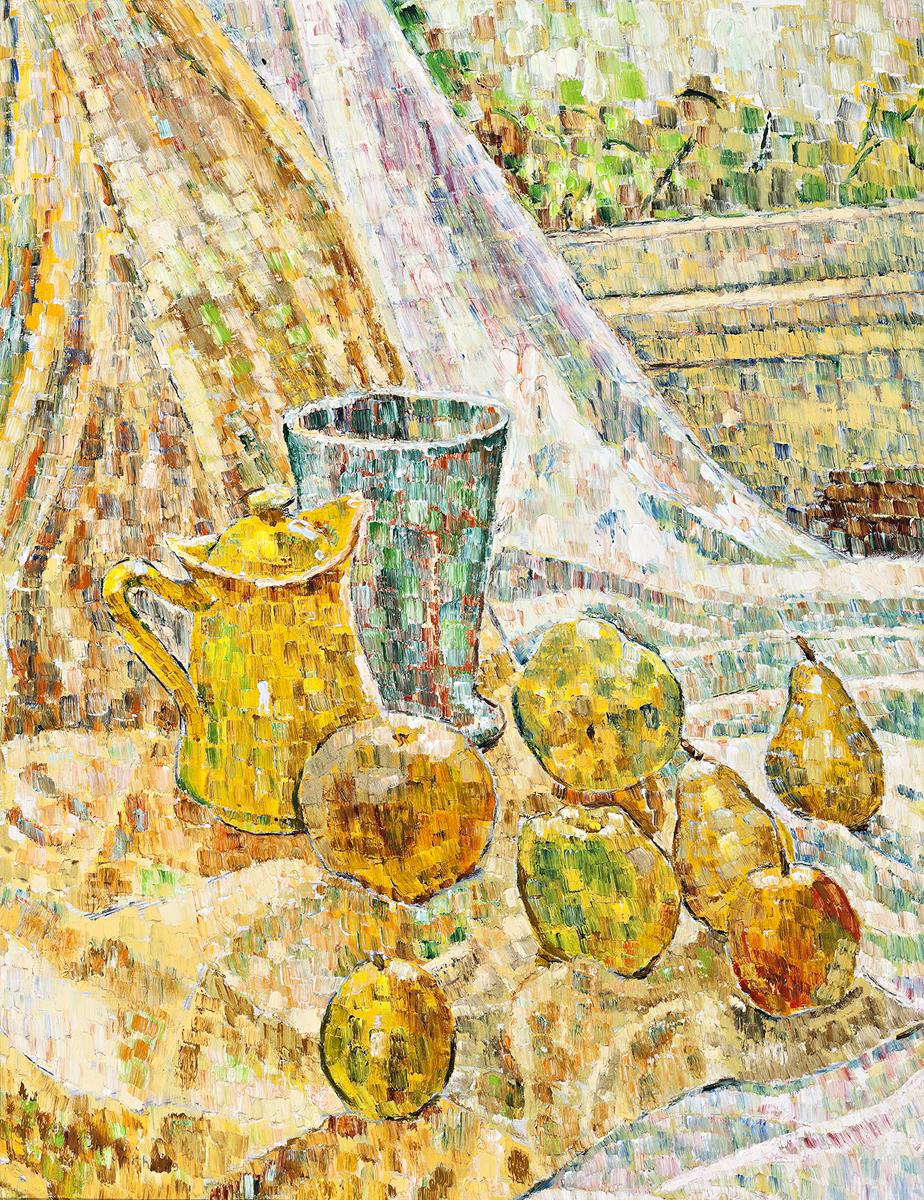 Throughout Still Life in the Window there is both a modeller at work and a colourist. Cossington Smith, who had experimented with sculpture and could readily turn her hand to carpentry, had a sculptor’s sense of three-dimensional form. With the exception of the window in the upper right, the image is formed of layers of cloth which are so complexly and restlessly draped, folded, tugged, pouched and pushed as to completely lose the forms of wall and table. Whirlpools of cloth ridge around the fruit and push back against the drapery’s impetuous fall from above. By contrast to the decisively-modelled topography, the fruit is not modelled at all. This is where the modeller gave way to the colourist, who excluded cast shadows as ‘superficial’.4 Instead, here, she has encompassed each piece of fruit and the jugs with a discontinuous, fine dark line within which the colour has intense and vibrant life. The brilliant effect is more Sainte Chapelle than the traditional love apples with decay already at work within their flesh. The fruit radiates light. It is as light as air.