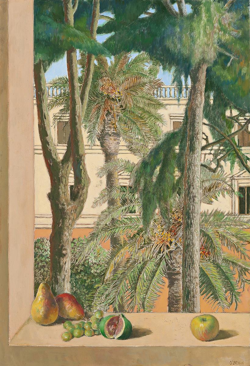 Still Life on a Window Ledge is a carefully considered study, delicately detailed and vibrantly coloured. The vision is of the window of his apartment close to Via Alberico II, within the old city center of the Italian capital, a stone’s throw from the roman Castel Sant’Angelo on the banks of the river Tiber.1 Whilst it is similar in composition to other ‘window paintings’ by the artist – in particular The Window No. 2, 1978, formerly of the David Clark AO Collection – the world beyond the window frame is undeniably Roman, populated by towering cedar trees and date palms heavy with fruit. The rich terracotta and cream colouring of the façade of the neighbouring building, along with its colonnade crown, also point to its carefully recorded geographical setting. The same verdant view appears in several of O’Brien’s paintings of the period, including Woman against a Window, 1993, Summer Afternoon, 1993, and Young Girl in a Mantilla, 1995. In his last interview with Christine France, published in the revised edition of her monograph, O’Brien expressed his enjoyment of the ‘much better view… which has beautiful trees in the courtyard and from the back I look onto the Nigerian Embassy’.2