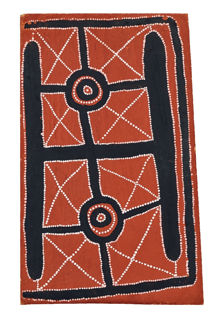 Story of Two Old Men, 1972 is one of three known paintings by the artist from the early 1970s. It was recorded as Painting number 13 in Consignment 15 from Papunya to the Stuart Art Centre, Alice Springs, the main outlet for Papunya paintings at that time. Two other paintings by Tjakamarra were recorded in the previous consignment to the Stuart gallery. One is a double-sided board from 1971, Tingari men sitting around waterholes, in the collection of the Museum and Art Gallery of the Northern Territory, Darwin3 that features an image related to this lot. The second painting, Two Snake Dreaming painted in March – April 1972,4 features bold black forms outlined in dots against an ochre red ground similar to those found in Story of Two Old Men.