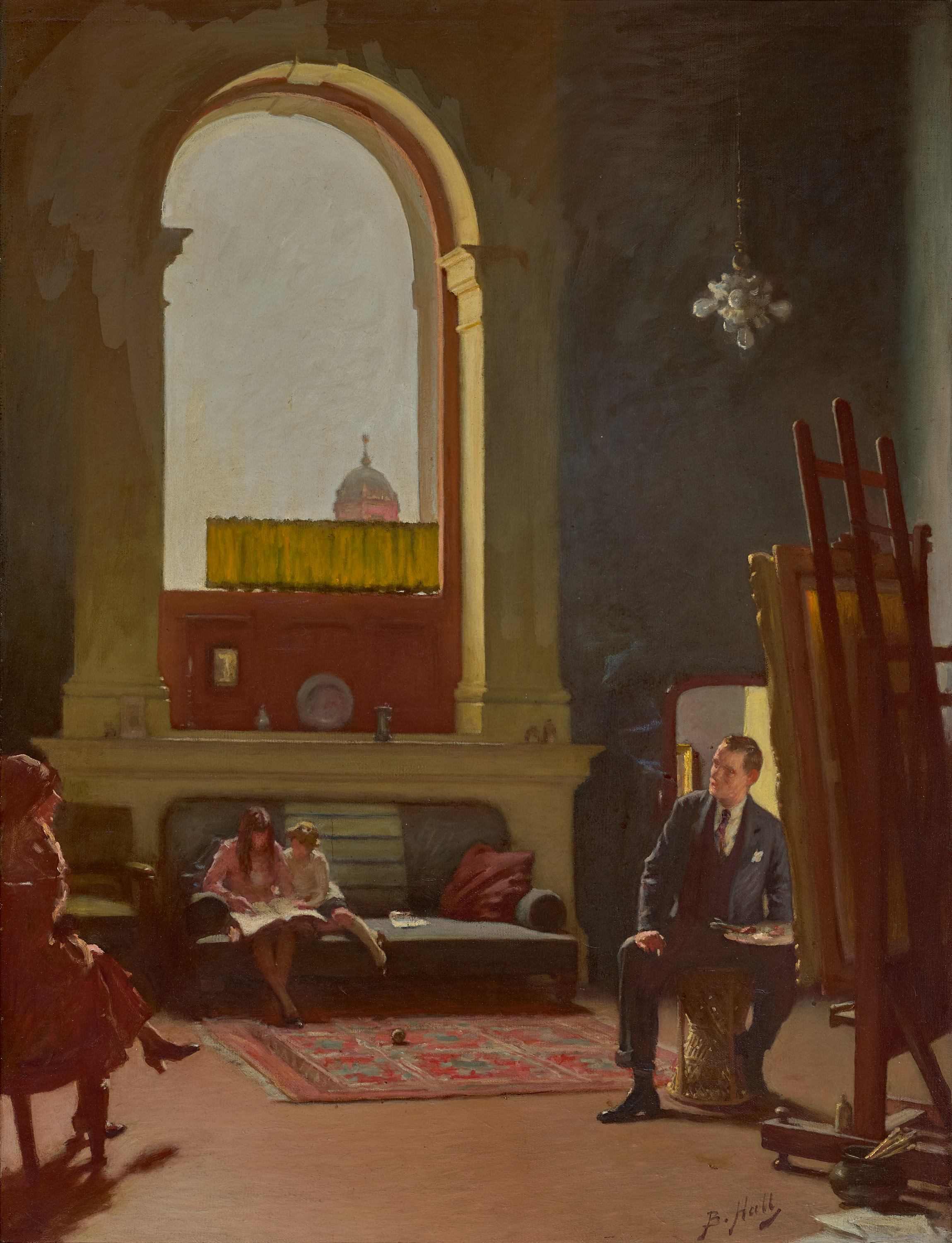 During his tenure at the Gallery School, Hall maintained a studio on the southern side of the State Library of Victoria building (which also housed the School and Art Gallery). Dominated by a large arched window, seen to great effect in In the studio, c.1924, the room dazzled visitors with its ‘bronzes, the antique chairs, the cosy settees in a half-light, (and) the hanging draperies, (which gave) it a delicious sense of Eastern languor.’1 Hall used his colleague Septimus Power, who had a studio in nearby Grosvenor Chambers, as the central model, with Hall’s wife Grace acting as the artist’s subject, and two of their children occupying the large settee at the rear.