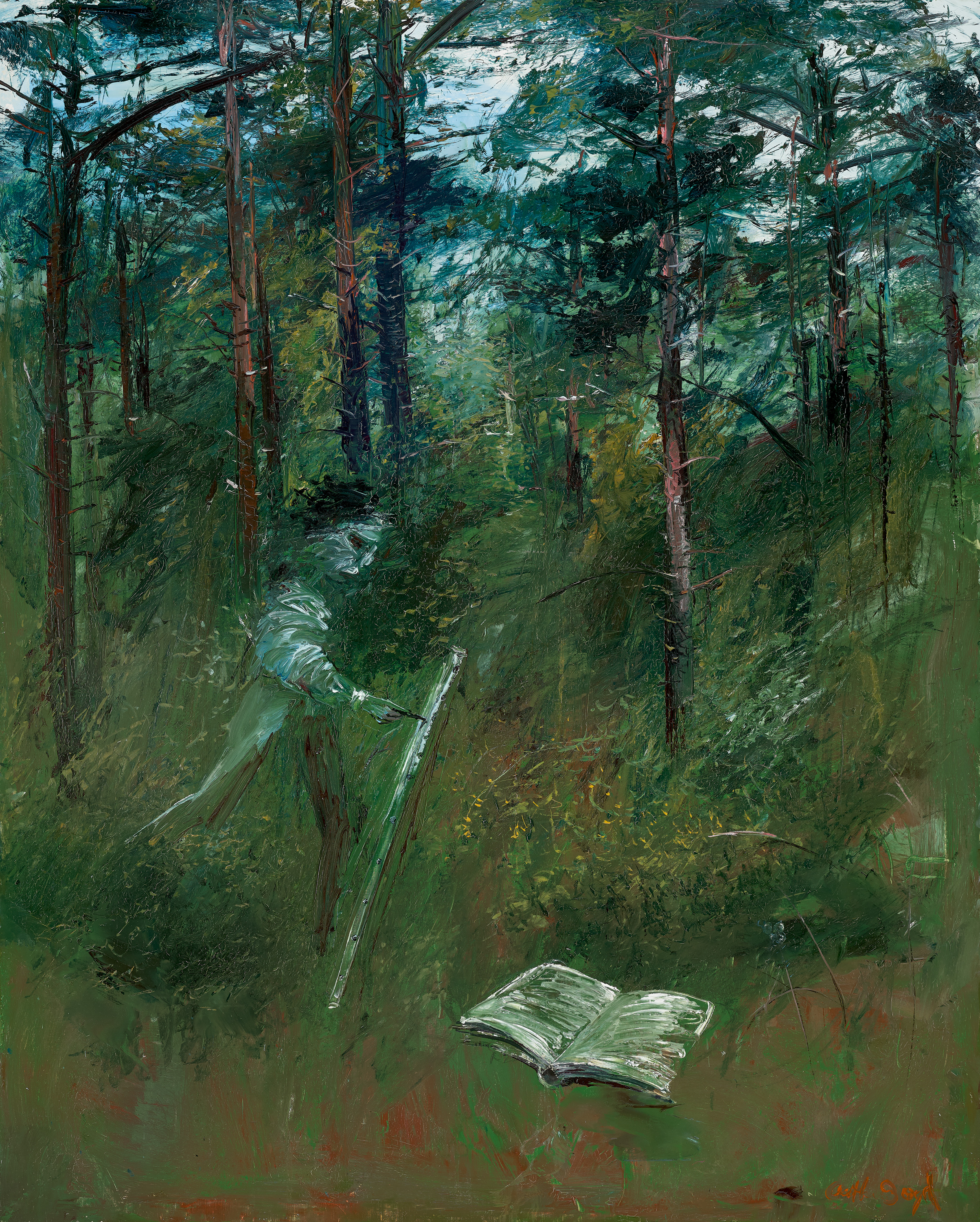 Suffolk landscape, figure and book, 1973, belongs to an extraordinary series painted by Arthur Boyd after he returned from his first visit to Australia in more than a decade. Having been awarded a Creative Arts Fellowship at the Australian National University in Canberra, he arrived to find himself dazzled again by the bright Australian light during the blazing summer of 1971 – 1972, leading him to question his connection to his homeland as well as his true intentions as an artist. By this time, he had been living in England since 1959, and had studios in London and in Suffolk, where ‘his studio window opened on to a copse of spruce, larch and other trees’1; it was within this quintessential English setting that he began his personal interrogation.
