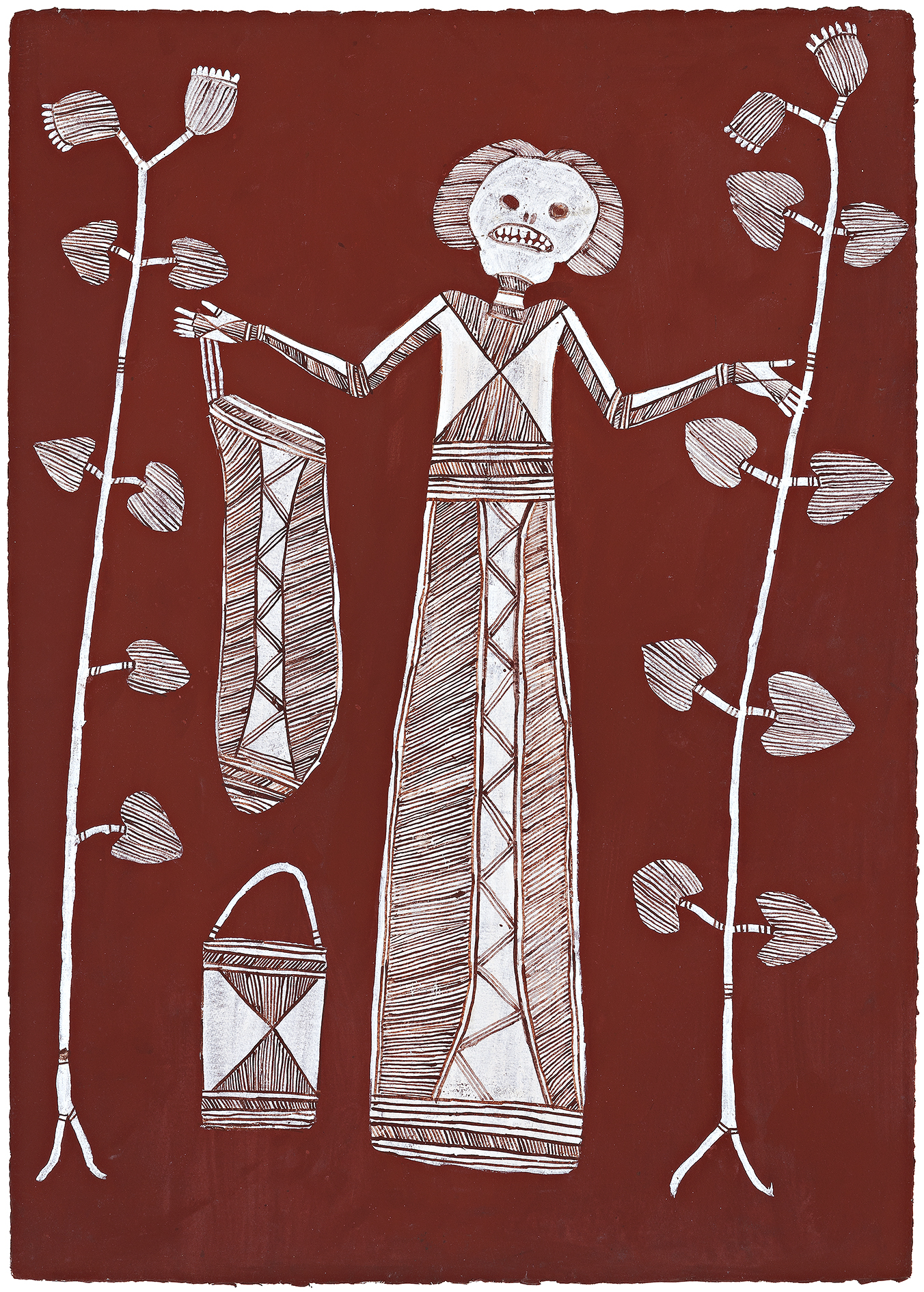This work is accompanied by a certificate from Marrawuddi Gallery which states: ‘Wakkewakken are a type of legless Sugarbag Spirit associated with Ankung Djang, a major Sugarbag complex in the Mok Clan estate in the Liverpool River. Here they live deep in the cold water at places like Djabidi Bakoluy, Bibiddoy and at Ngaldaddubbe. During the day the Spirits leave their homes and move around the country gathering an edible bush fruit called Anwak (LeeaRuba). She lives at these places with Ngalyod the Rainbow Serpent and other Sugarbag Spirits.’