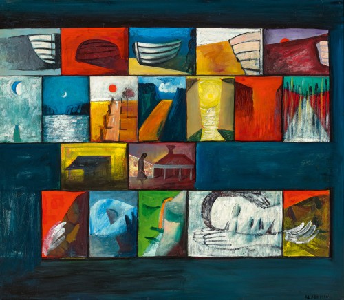 Having confined the figurative element of this painting to five individual sleeping figures in the last row, Blackman veered sharply away from the crowded parade of masks and secret gatherings that characterised his earlier Suites. A sense of tension and pregnant possibility is instead created through vignettes of landscapes: empty and beached boats on stark shorelines; reflected moonlight on still water; receding pathways to nowhere and deserted bungalows illuminated by ominous red suns. This Suite of Paintings reunites many of Blackman’s most popular motifs, painted in high key tones, and immediately legible graphic stylisation stripped of superfluous detail and outlining the most key elements with severe black lines. Reprising a motif from his major 1956 painting, The Boat (now in the collection of the National Gallery of Victoria), the empty boats are transfigured into vessels of the imagination, having delivered the viewer to a non-specific oneiric location which can only be glimpsed at through narrow cut-out windows. The figures that inhabit this world seem to be able to float between the frames, appearing intermittently in the first and third rows. Felicity St John Moore suggests that the dreamlike contrasts in Blackman’s works were inspired by the works of French symbolist painter Odilon Redon, ‘a duality of dark and light, fantasy and fat, inside and outside, nightmare and drama, harshness and beauty, mysterious expression and pure plastic substance. This duality is internal as well as thematic… the imagery is enigmatic and multilayered.’1