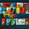 Produced alongside these numbered Suites painted specifically for the scholarship, were a number of large paintings of a similar format, some of which were exhibited in Blackman’s sell-out exhibition in Brisbane’s Johnstone Galleries in June 1960 (where three works bore the title ‘Suite of Paintings’). This Suite of Paintings, 1959 – 60 in the collection of the National Bank of Australia was formerly held in the private collection of Barbara Blackman, the artist’s wife, and was never exhibited commercially. Painted in London on Swedish hardboard, Suite of Paintings is composed of four uneven rows of alternating horizontal and portrait format scenes. The upper and lower edges of this suite are bordered in thick bands modulated black-blue paint, which seeps into last two sequential rows. The unevenness of this sequence is unusual in a Suite painting of this period, as are the thin black borders between each window.