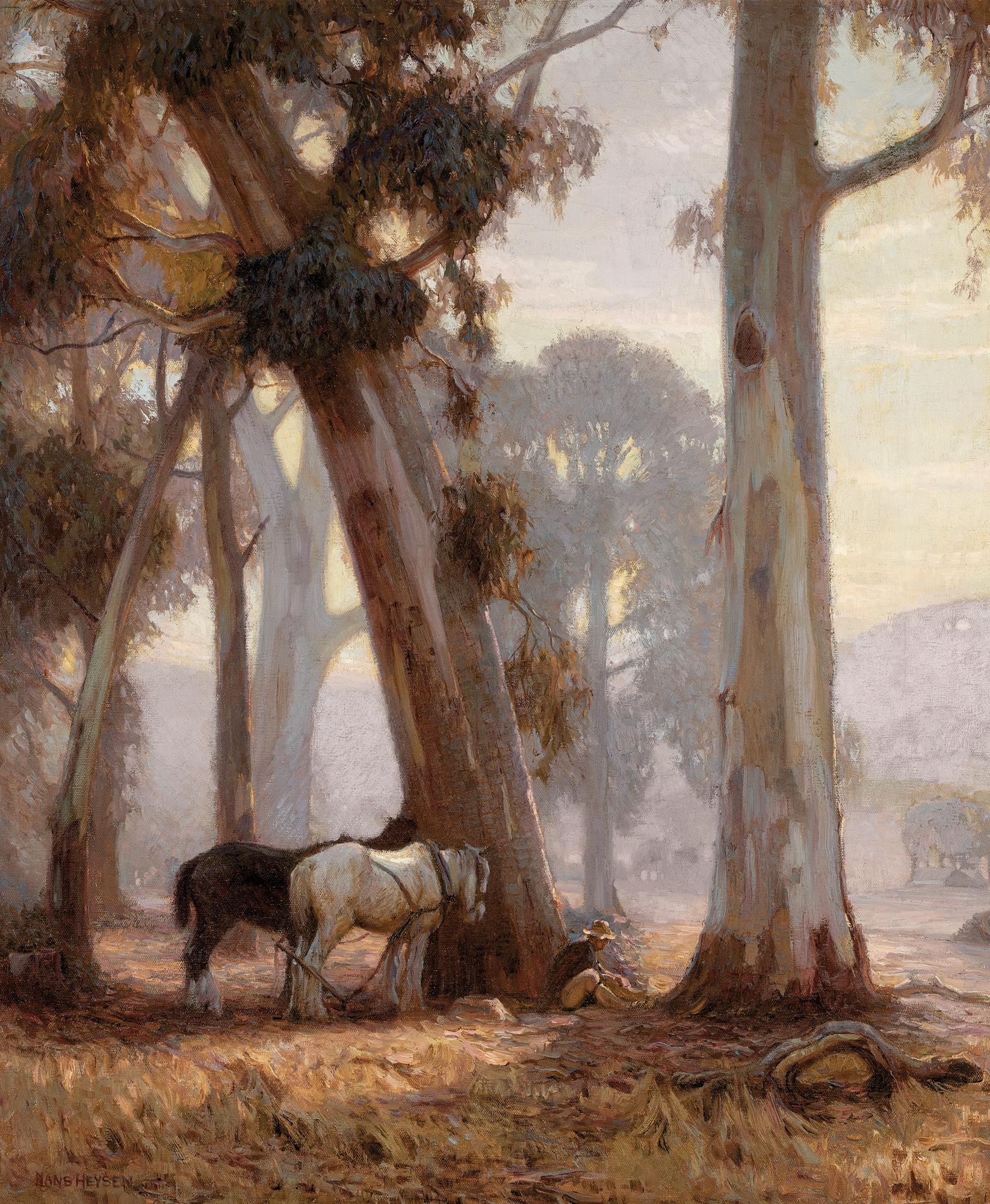 ‘Mr. Hans Heysen, who sends many beautiful things from Adelaide, has a strong vein of natural poetry. He sees nature beatifically, and the commonest things take on a charm rendered through the eye of his vision… Mr. Heysen has painted the landscape of the year in his “Summer’s Day.” Cast against the light, the big blue-gums rise transparently against the smoky day, enveloped in a haze of heat suffocating and still. In their shadows doze the plough horses, the white one catching a sickly gleam of light. Blinded by the haze, the range fades palpably away; the poor earth seems athirst for rain or the coolness of night, tortured by the cruel glory of the sun. And all this is conveyed by the sheer truth of the painter’s vision, by his careful observation, without agitation, without dramatic accessory.’2