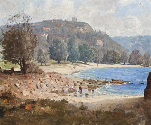 Rees famously described his first glimpse of Sydney harbour from the porthole of a ship which had brought him from his home town in Brisbane: ‘Opal-blue water, a band of golden sand, another of olive-green trees … It was one of those early calm mornings, when all was veiled under an ethereal mist of blue through which the sun struck on golden foreshores and russet trees, and depicted in creamy light’.2 It is a description which could easily match the painting on offer here. On his return from Europe, Rees had attempted to infuse his paintings with some of the classical atmosphere and solidity he had studied first-hand in the works of the Italian masters. However, recognising its inappropriateness to the local scene, he reinvestigated the art of Arthur Streeton and took from it many cues such as the immediacy and freshness of the artist’s brushstrokes and, in particular, his authentic celebration of the unique Australian light. Like Streeton’s own harbour scenes, there is a remarkable interplay on display in Summer Morning between the ruggedness of the shore, the expanse of sandy beach, the sudden rise of the promontory and self-absorption of bathers exploring the rocks. Such bucolic days were soon to end for the artist however as in October 1927 his wife and newborn son tragically died during childbirth, an event which resulted in a complete nervous breakdown for Rees. Unable to paint standing up, as was his norm, he instead focussed on drawing for the next five years meaning this painting is one of the very few that survive from the period.